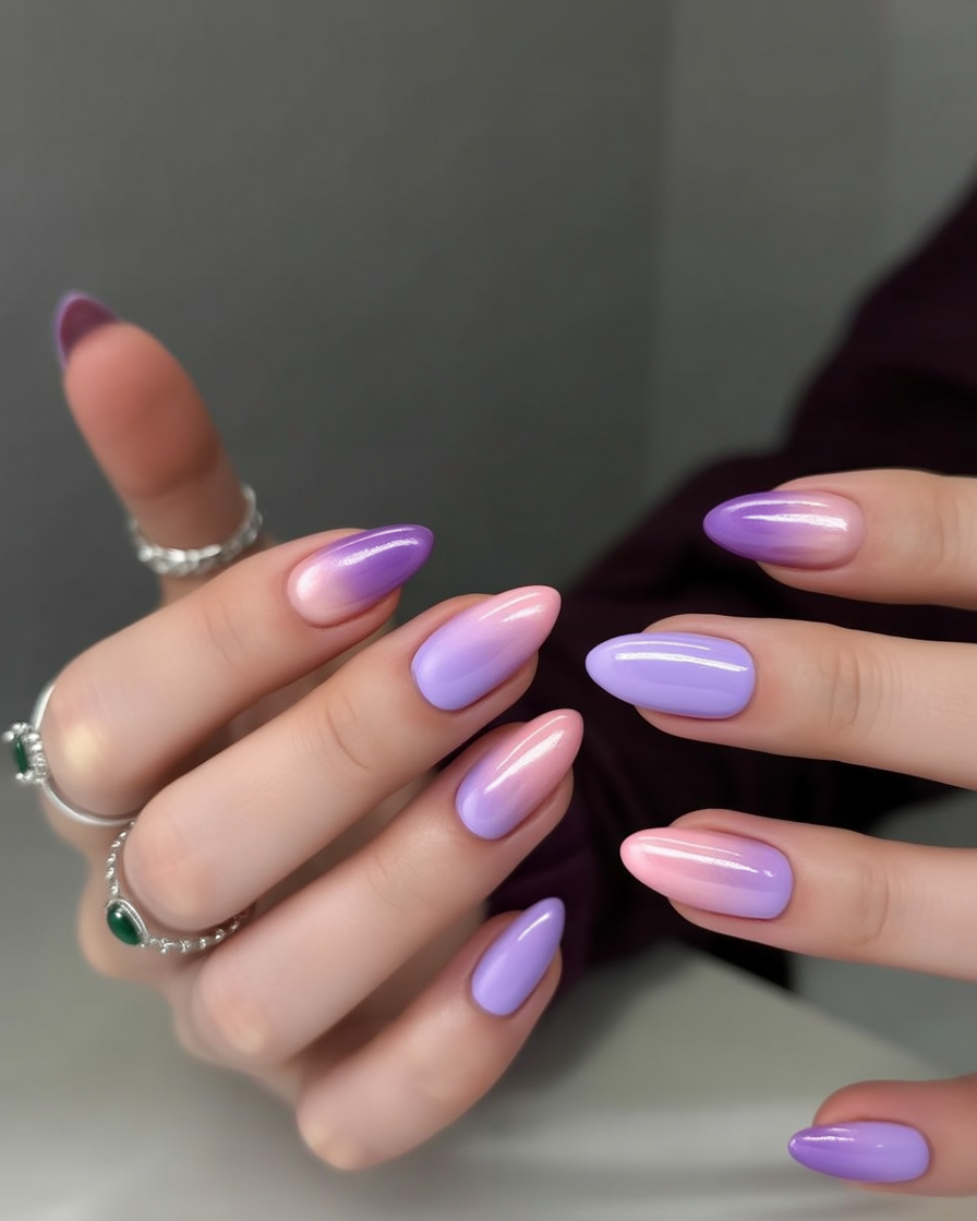 These lilac almond nails have a gentle glow that feels calm, feminine, and quietly confident. The soft gradient and glossy finish create a polished look that feels soothing rather than dramatic. It’s the kind of manicure that makes you feel put together even on low-key days.