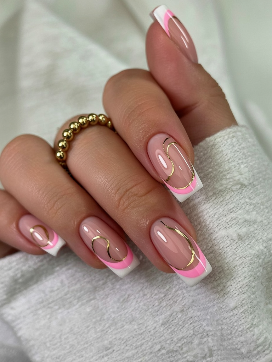 This manicure feels elegant with a modern twist. The soft pink base keeps it classic, while the white tip and delicate gold line add just enough interest to make it feel intentional. It’s polished, refined, and quietly luxurious—perfect for women who appreciate subtle details that don’t scream for attention.