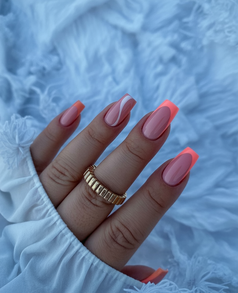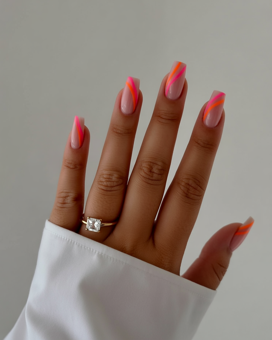 This design feels bold, upbeat, and unapologetically joyful. The neon pink and orange combination instantly grabs attention, but the clean square shape keeps it from feeling overwhelming. It’s the kind of manicure that makes you feel energized, like putting on your favorite lipstick before heading out the door.