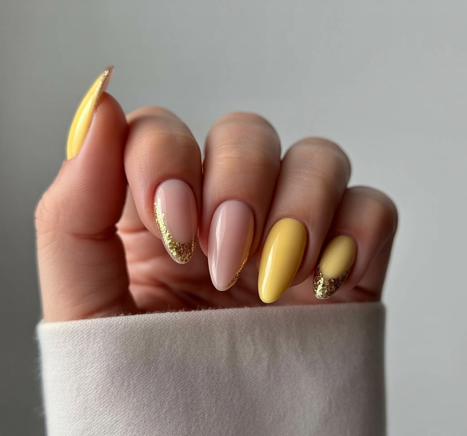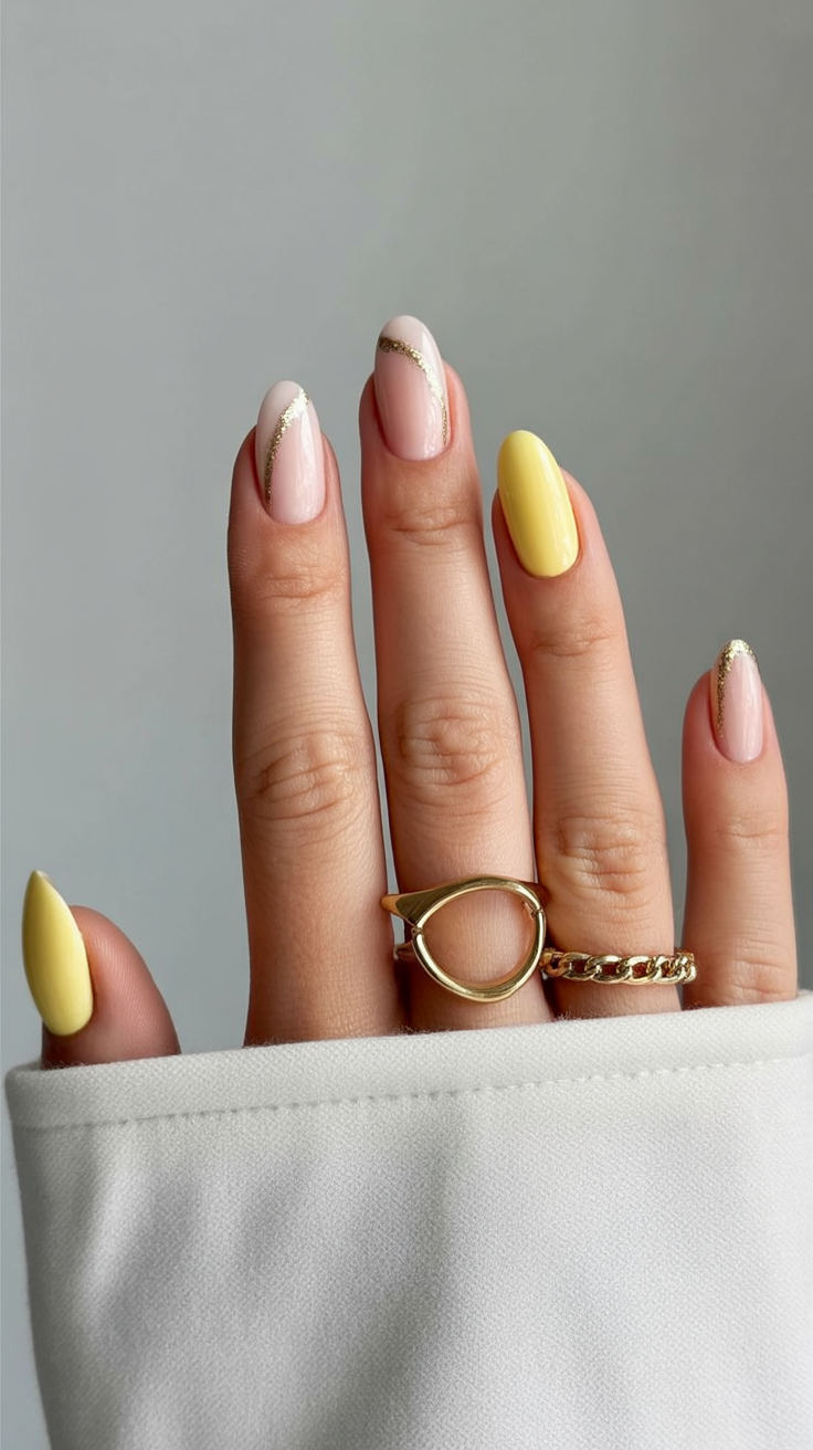 This design feels quietly elegant, the kind of manicure that whispers good taste rather than announcing it. The nude base keeps everything calm and polished, while the soft yellow nails add a gentle glow that feels optimistic and light. The thin gold accent line brings just enough detail to make the look feel intentional and refined, like a favorite piece of jewelry you wear every day.