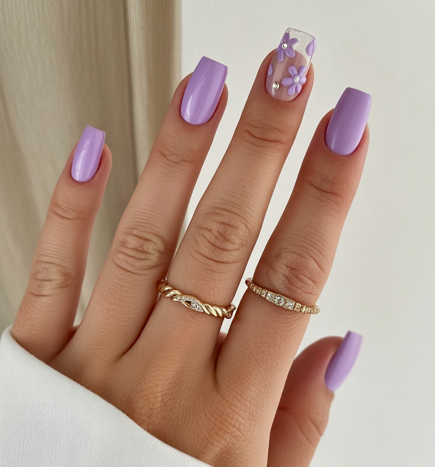 15. Lavender Square Nails with Floral Accent