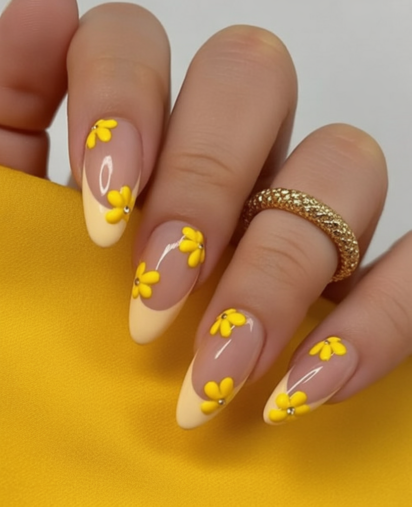This look feels playful in the best possible way. The yellow French tips instantly lift the mood, while the tiny flowers keep it sweet and approachable. It’s fresh, optimistic, and full of that early spring energy when everything feels possible again. There’s a youthful spark here, but it’s balanced by a clean, polished finish that keeps it sophisticated.