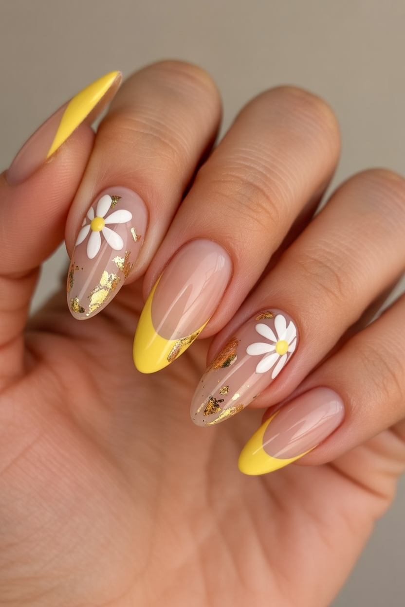 The nails are joyous and a tad bit classy. The playful design and the luxurious feel are obtained with the gold foil. The art design, a little floral design, and gold foil add a tad more play to the classy side of it. The yellow tips bring brightness and optimism, which are more than a little. Polished and playful, it brings a tad more art to the design. That makes it feel more personal.
