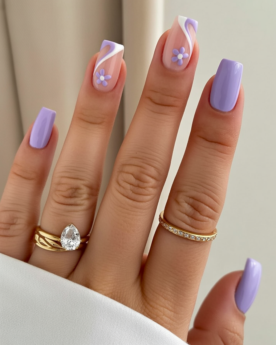 20. Lavender Square Nails with Floral Accent