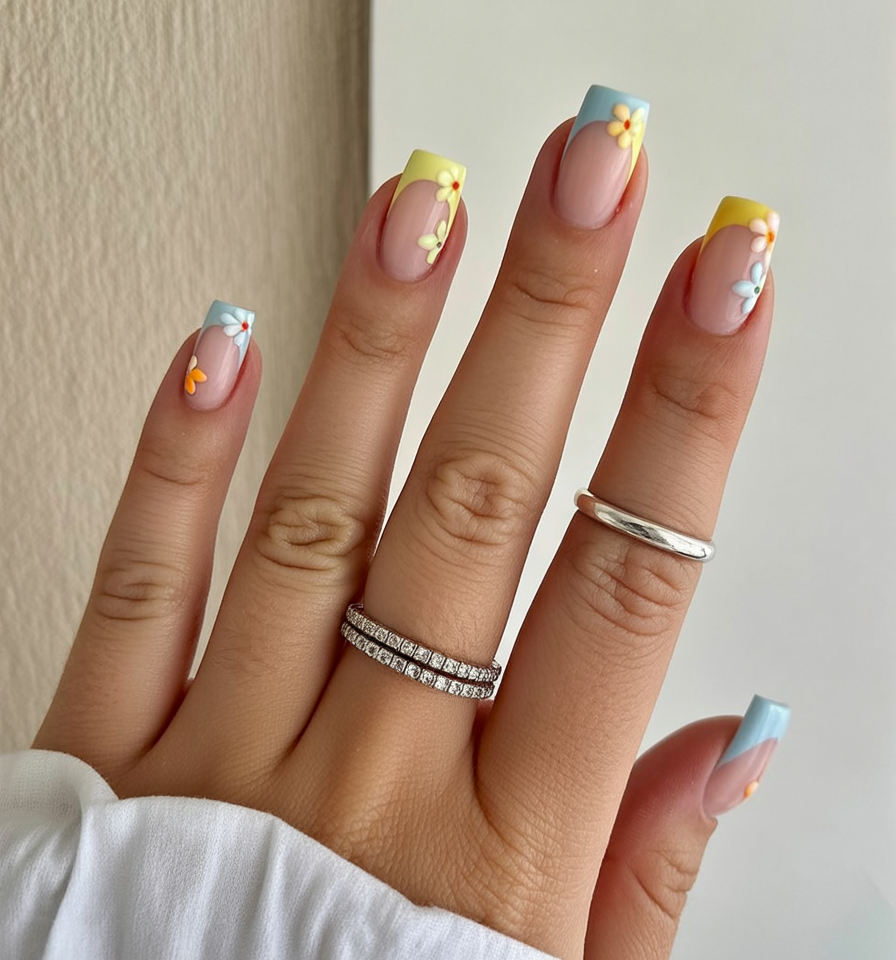 These nails feel sweet, cheerful, and full of personality. The pastel tips give a playful twist to a classic French look, while the tiny flowers add charm without overwhelming the design. It feels youthful in spirit but still polished and grown-up.