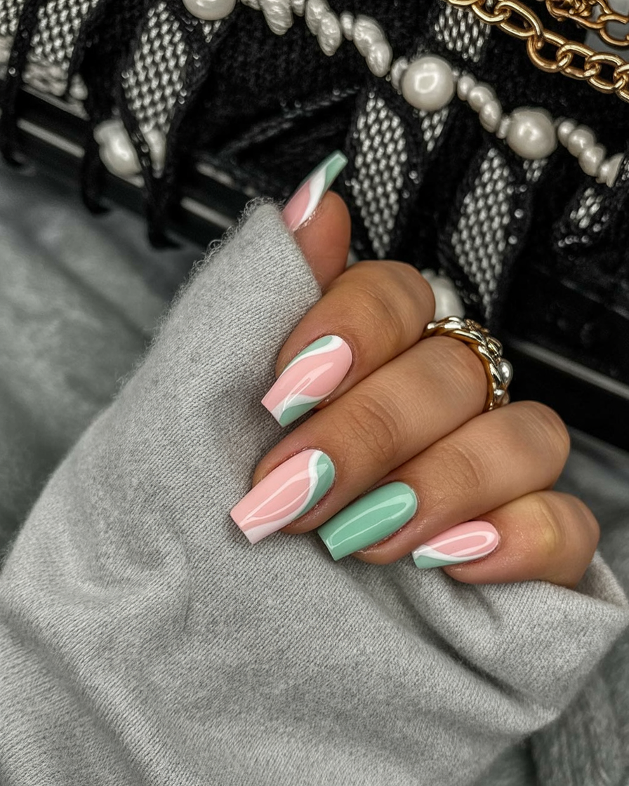 18. Mint and Pink Wave Square Nails