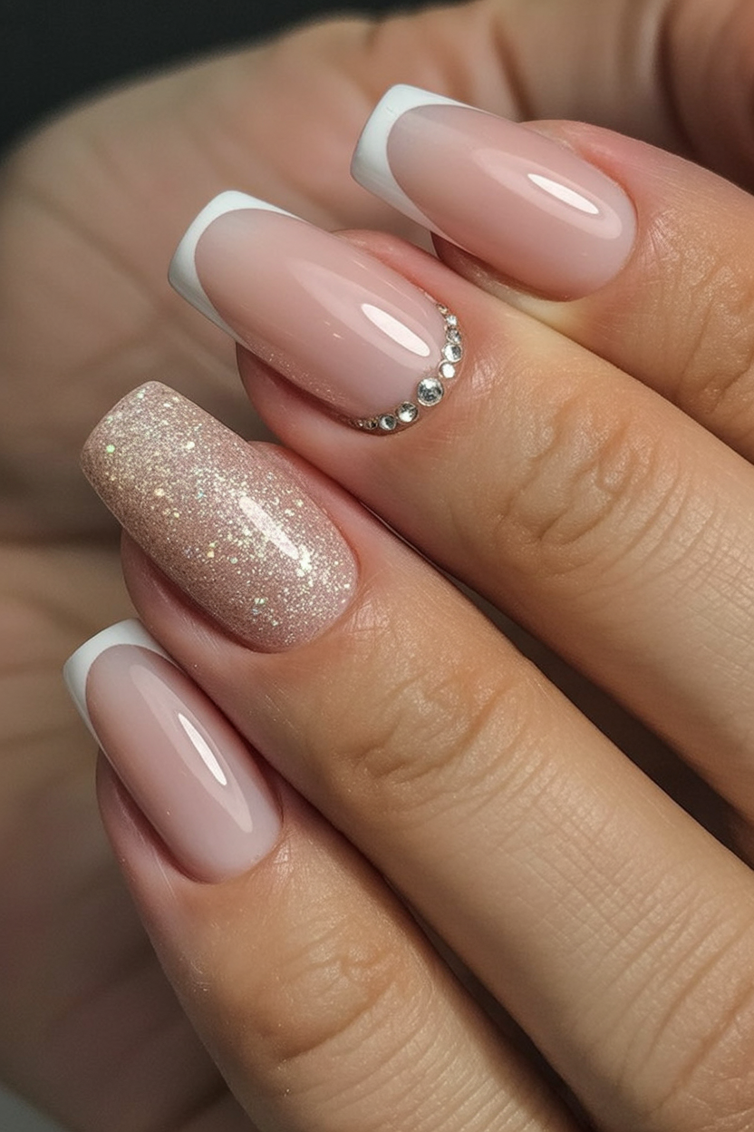 The classic French tip is given the 2025 explanation with a bit of shimmer and rhinestones finish. Rather than following the trend, this set comes with contrast â€Many traditional nails are replaced with a single glitter nail that adds to the festivity, whereas others remain clean and elegant. It is subtle and bold at the same time and feels just right to be on a woman who wants her manicure to be versatile yet never the same.