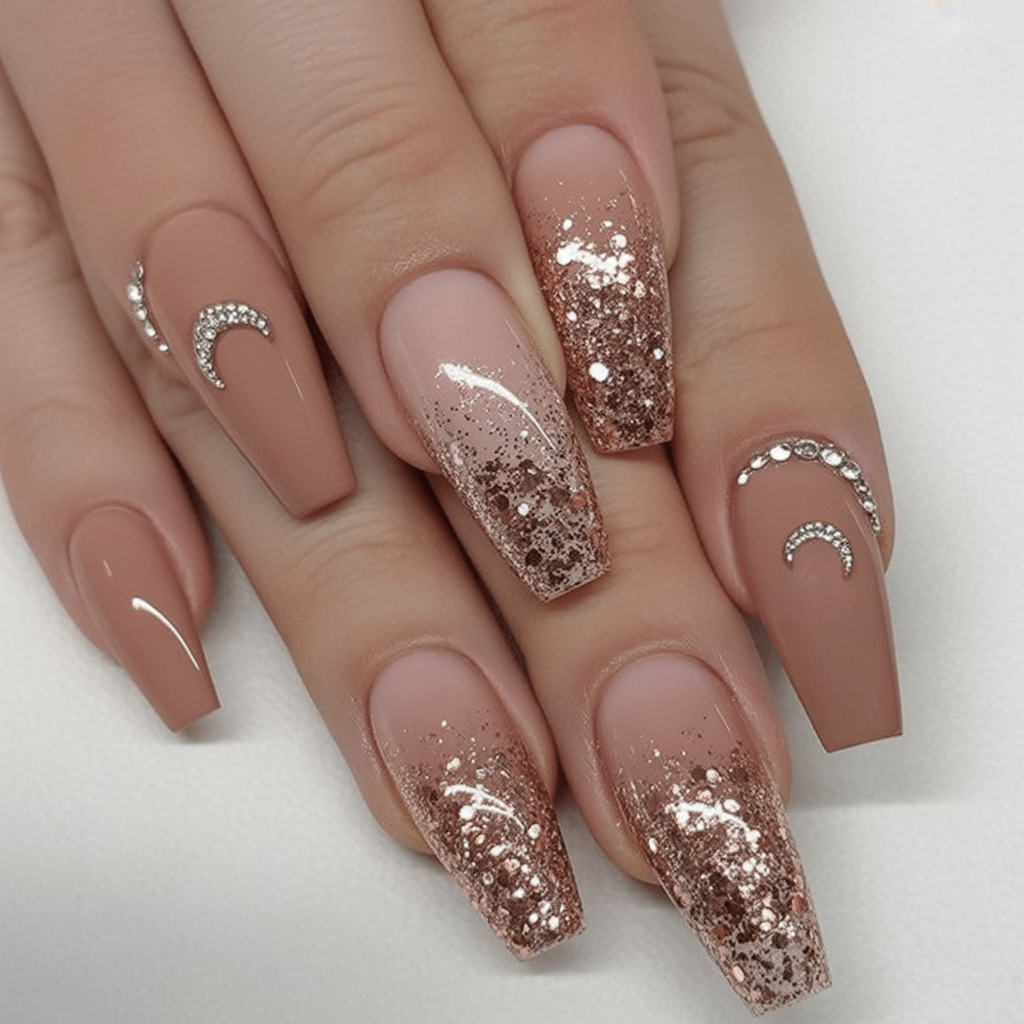 Metallic, striking and not afraid to be too much, these long nails are the embodiment of a baddie. The nude-brown foundation is coupled with iridescent bronze fades with golden highlights and the rhinestones are shaped like crescents, making the entire look look starry. It is a manicure that will not be ignored- the kind one will desire to wear when he/she wants to wake up and take control of the room.