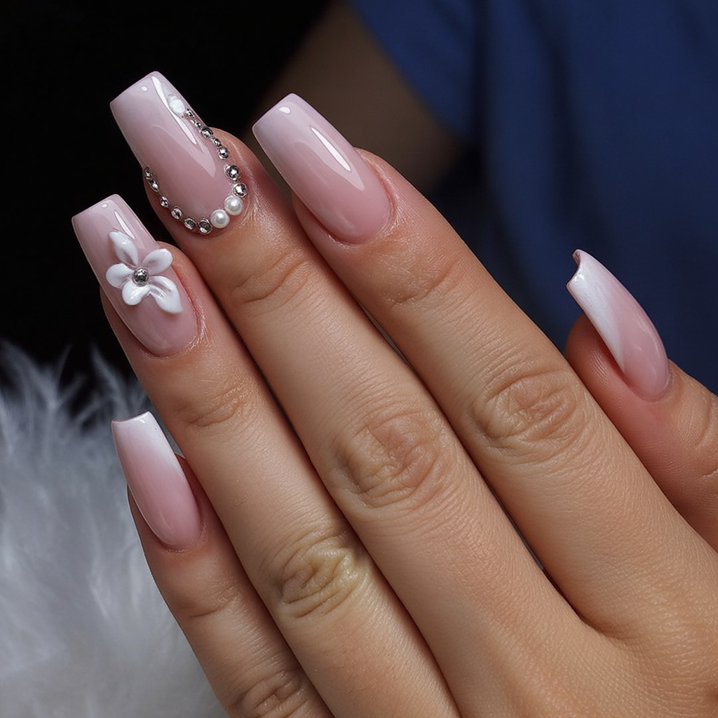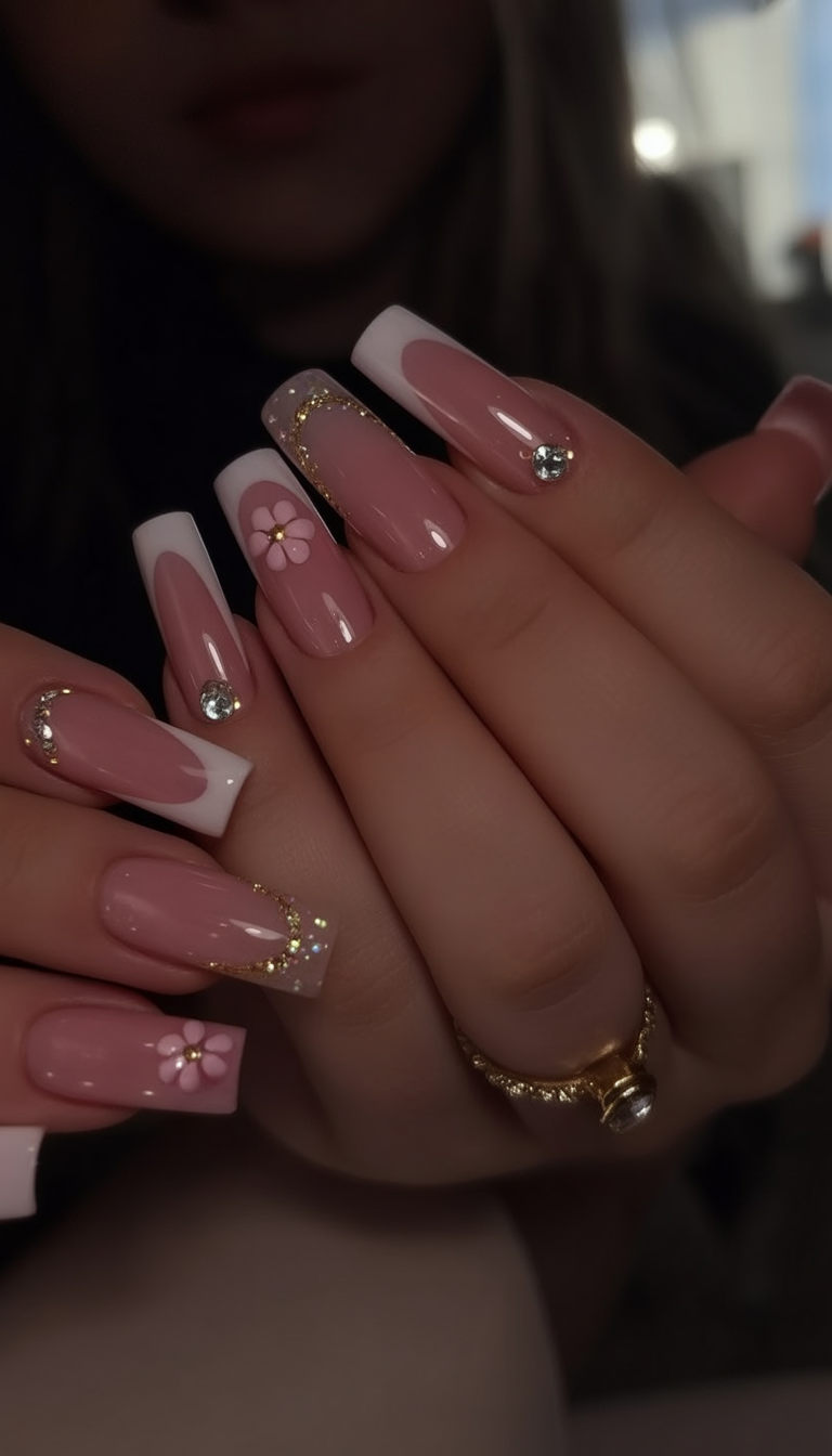 These Playful French Nails in pink acrylic offer a balancing of sophistication and fun. The light white tips are matched with a subtle floral decor finished with rhinestones making it feel like springs flowers attached to your fingertips. It is an uplifting yet mature design that will immediately freshen up your appearance but still remain sleek enough to go anywhere with you.