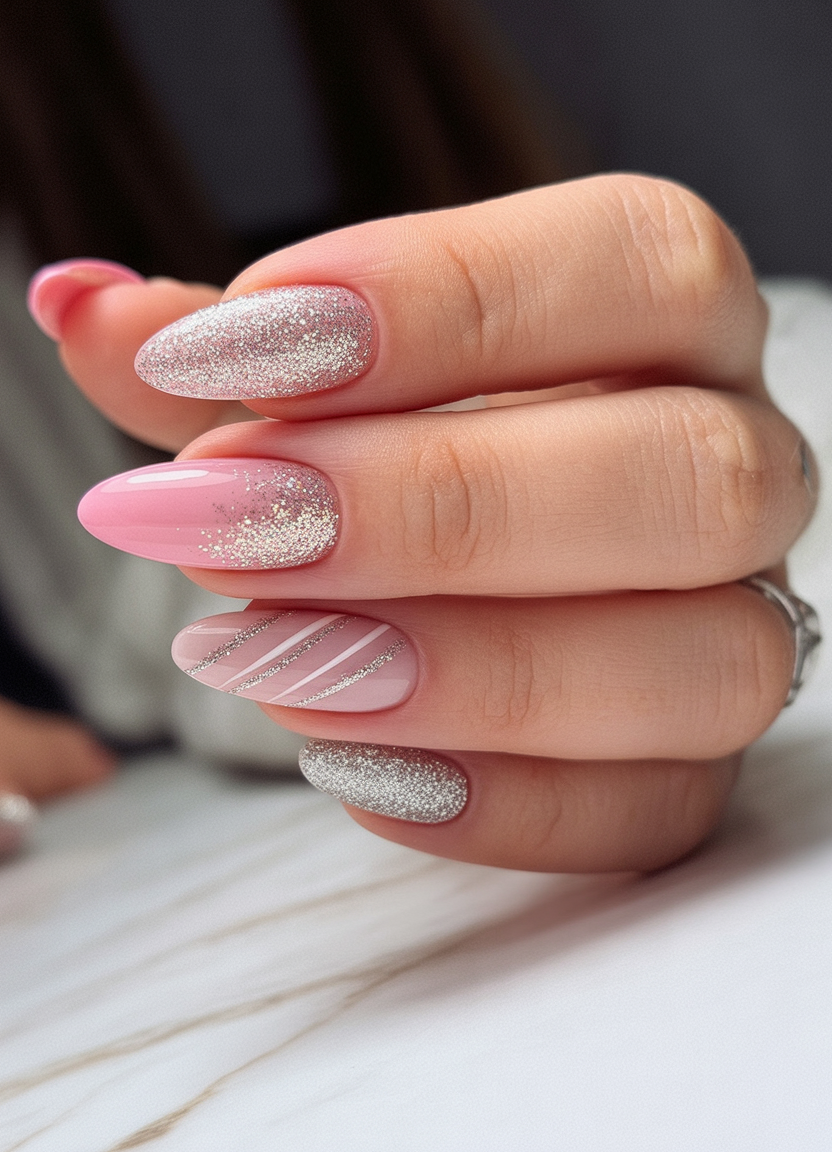 This design is simply gorgeous to the individuals who want to experiment with a fun twist on classic looks. The fineness of the soft pink with the dazzling quality will suit every skin tone. This is a classic nail shape also easy to match with everything, whether it is a ragged, airy dress, or relaxed jeans.