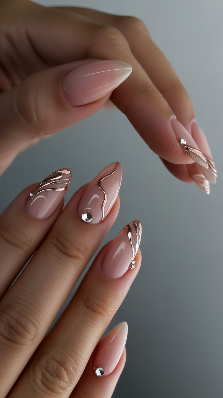 These nails are poetry in its most flawless form- almond shapes with cascading rose gold lines resembling jewelry dangling titivating your fingers. The glitter of miniature rhinestones provides much needed glamour, almost as though one has adorned rings, without putting one on. It is such a design that you would want to wriggle your hands just so you could show them off.