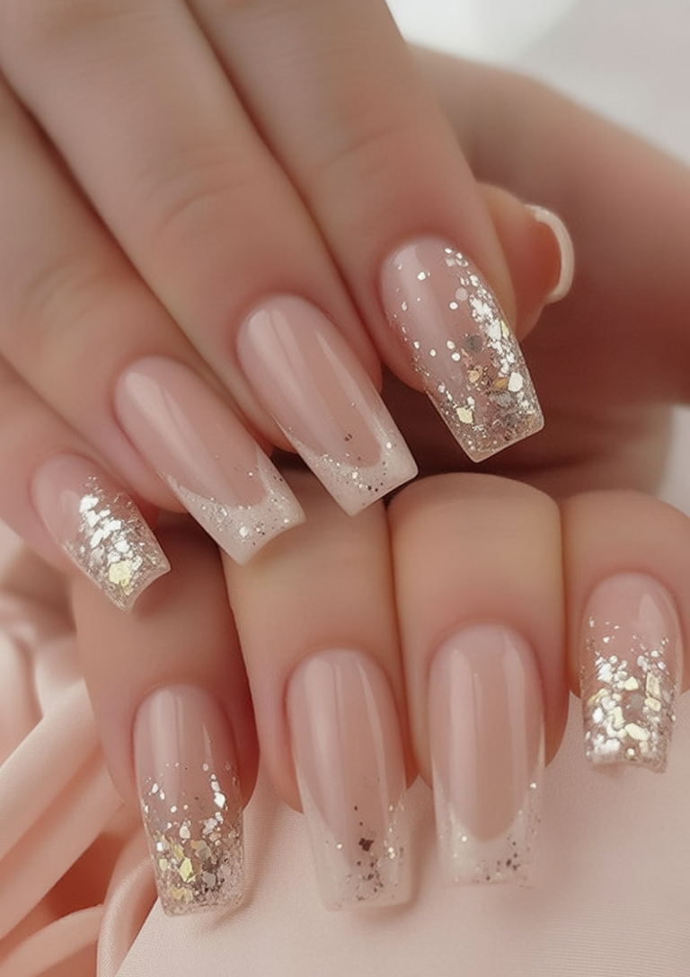 There is an inextricable appeal of soft ombre fading into a hint of acrylic white such as a canvas being painted in gold. This nail color has a luxurious finish with sparkles which are not too much to feel festive or over the top. Even the disperse golden flakes have a luxurious but wearable feel to them that spreads out and catches the light. It can be considered your best fit-in: fancy enough to wear at the evening dinner but not too much to a lot of day time in the office.