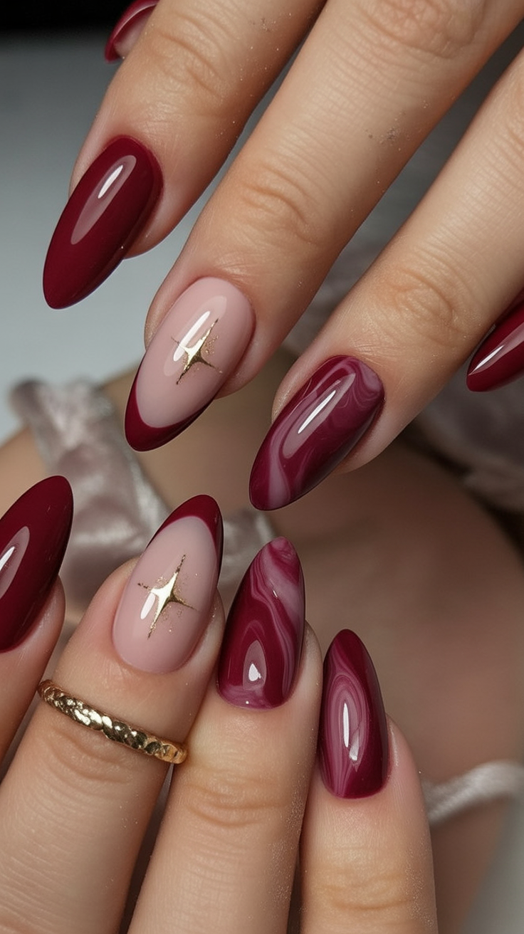 Deep red and soft nude is a combination that cannot be mistaken- it is sexy, dramatic and bold all at the same time. The marbled swirls and golden starburst details make the look stylish and glamorous, to give your hands more credit as an accessory. It is a proclamation nail art that tells secrets of luxury yet shouts of confidence.