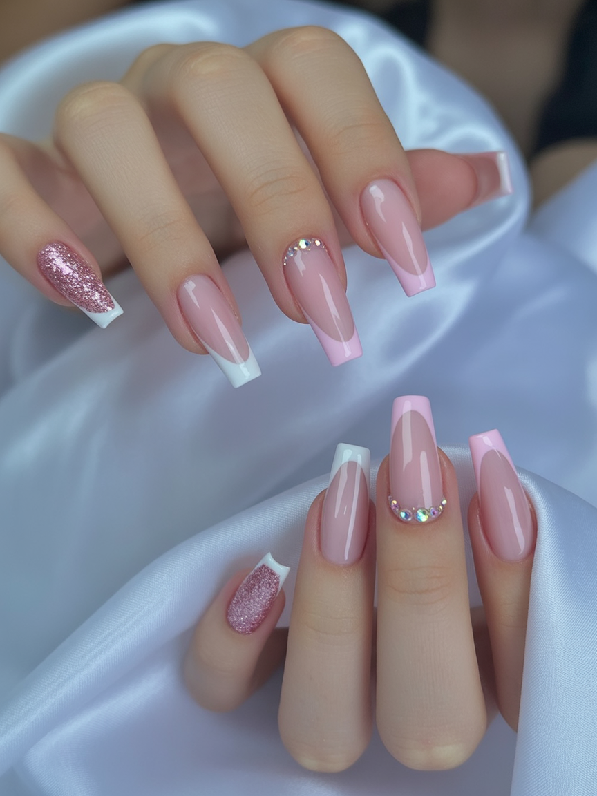 Sweet, playful and a little glamorous, these pink and white French nails will do just that. They feature glitter accents and a bit of rhinestone sparkle so when you want to be feminine but not dull, these are what you want to wear. The combination of pink tips and classic white will seem refreshing and modern with the whole set having a youthful appeal.