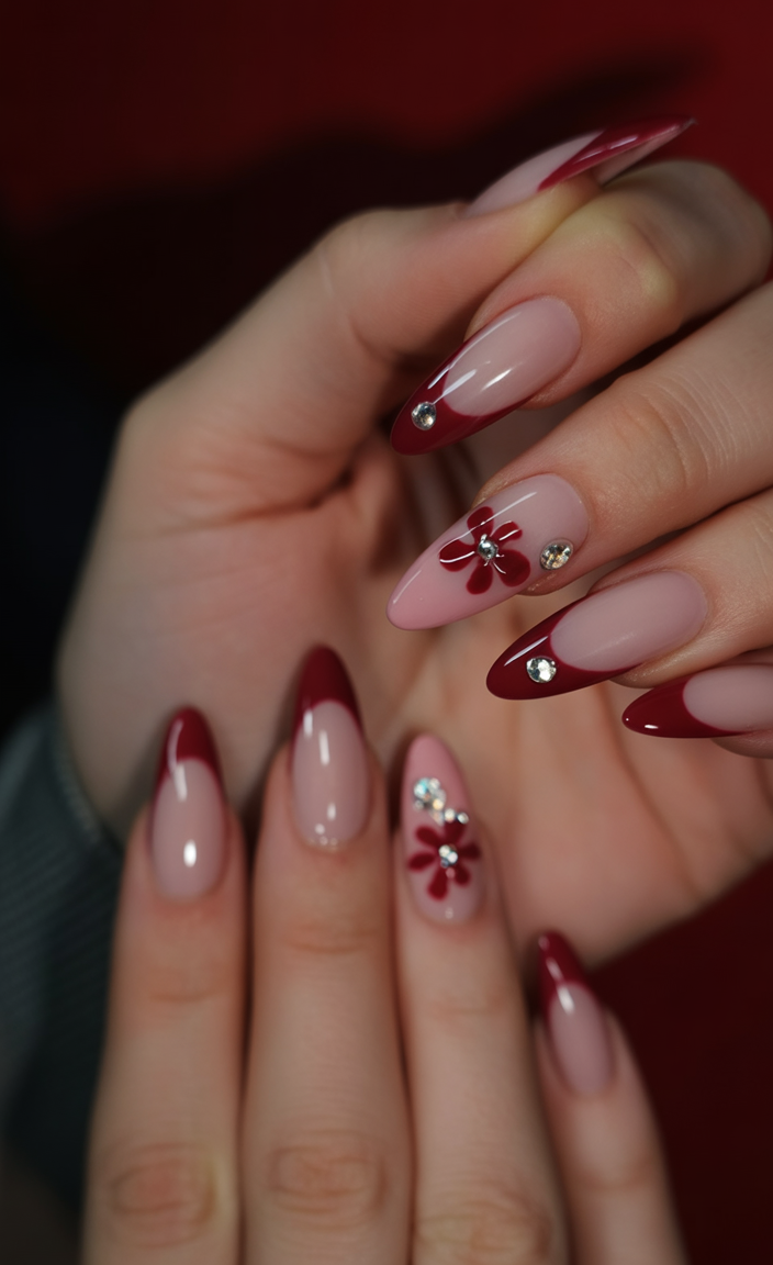 This style is perfect among women who adore long nails and would love a style that feels both classic, yet tough. Looking fabulous on special occassions or date nights, the floral rhinestones provide some feminine balance. They are a hair polish diversion of regular red French tips and are more dramatic than the latter, hence, the ideal selection in the case of someone who does not want to appear over-the-top.