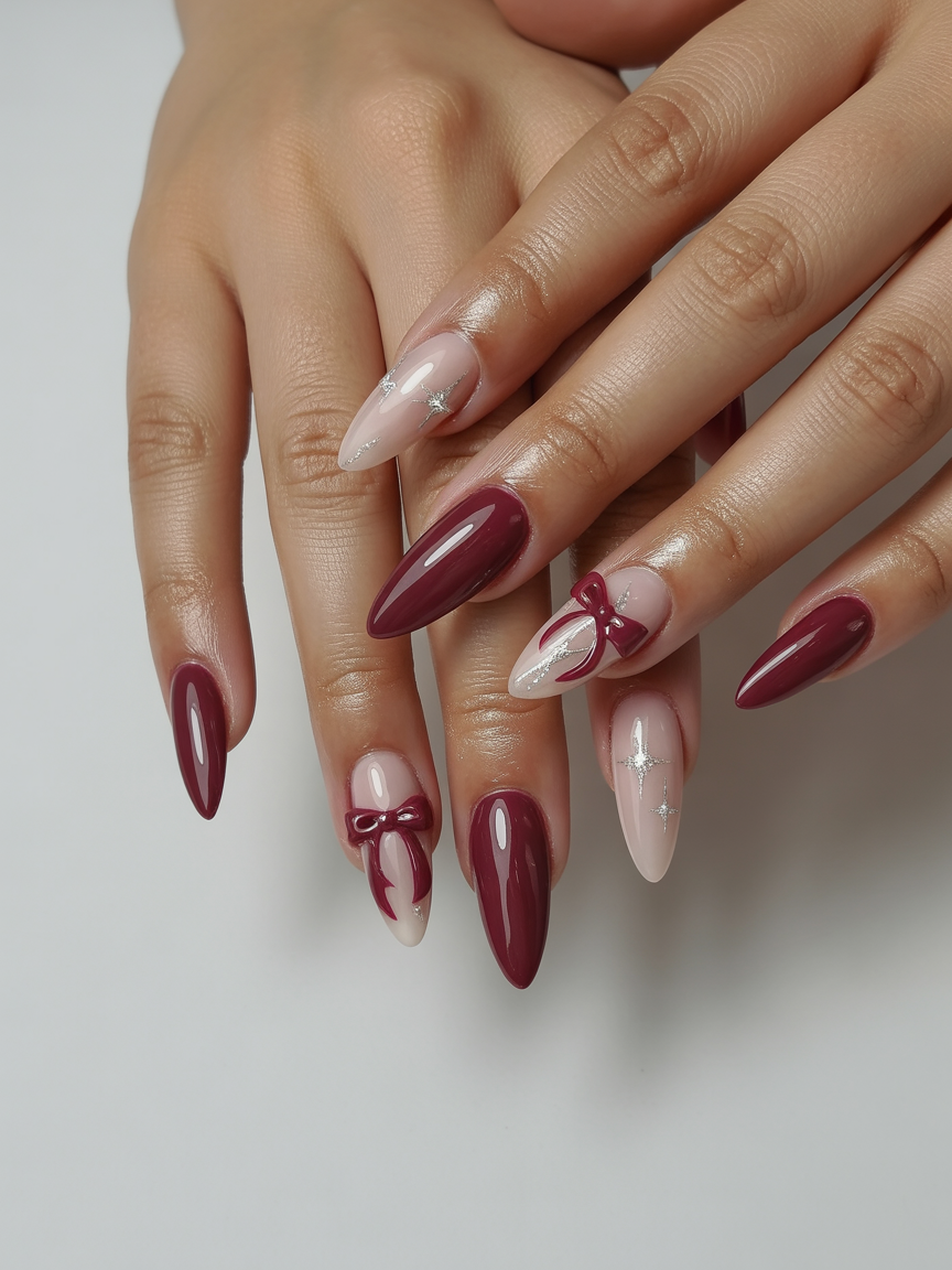 These nails are as though they are an unwrapped little gift each time you look at them. Dark burgundy and light nude contrast nicely with one another, and the 3D bow details make the shoe cool and casual yet elegant and stylish enough to be worn all winter and during the upcoming holidays. The glossy finish keeps everything looking polished and glamorous.