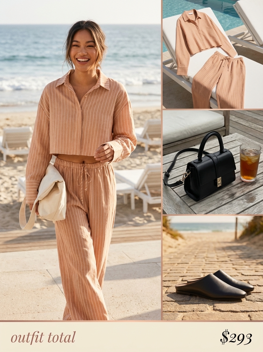 These are surprisingly versatile, and this sophisticated yet relaxed ensemble, totaling $345.40, offers a perfect option for resort lunches or day trips, ensuring you look put-together yet comfortable. The look features a beige linen blend matching set with subtle pinstripes, including a cropped button-up long-sleeve top and wide-leg drawstring pants, which is a key example of stylish beach outfit sets. This linen blend co-ord kept its crisp look after 4 hours of shopping in warm, humid conditions, showcasing the material’s resilience. The outfit is elegantly completed with black leather mule loafers and a sleek black handbag with gold hardware, elevating the overall ‘Casual Coastal Glam’ aesthetic, making it an ideal choice for those who want comfortable and chic casual beach outfits women.
