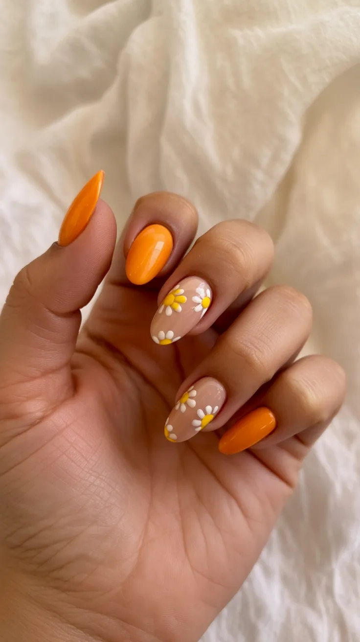 These nails are pure sunshine in manicure form. The bold orange shade instantly lifts your mood, while the delicate Flowers bring balance and softness. There’s something very Cute about the contrast—bright, cheerful Colors paired with a calm, natural base that keeps everything feeling grown-up and intentional.