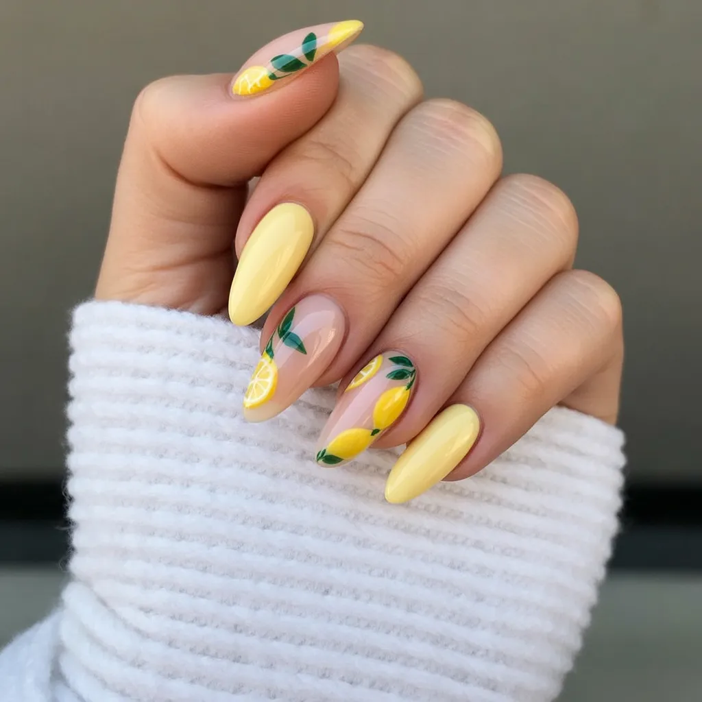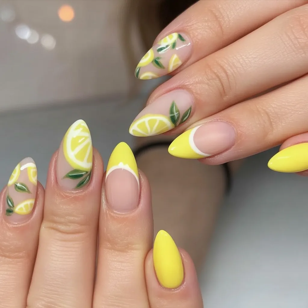 The yellow color of the Almond nails is beautiful and exciting. The hand-painted lemon slices are a very nice touch to the almond nails that are paired with a painted lemon color.