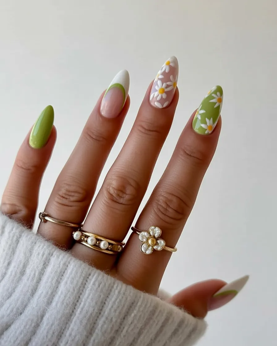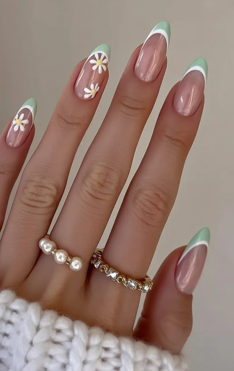 This design looks calm, fresh, and collected, perfect for a spring day. The green French tips add a soft spring essence and the daisies add a simplistic charm. All the details come together so you can look stylish and collected with a full set of confidence.