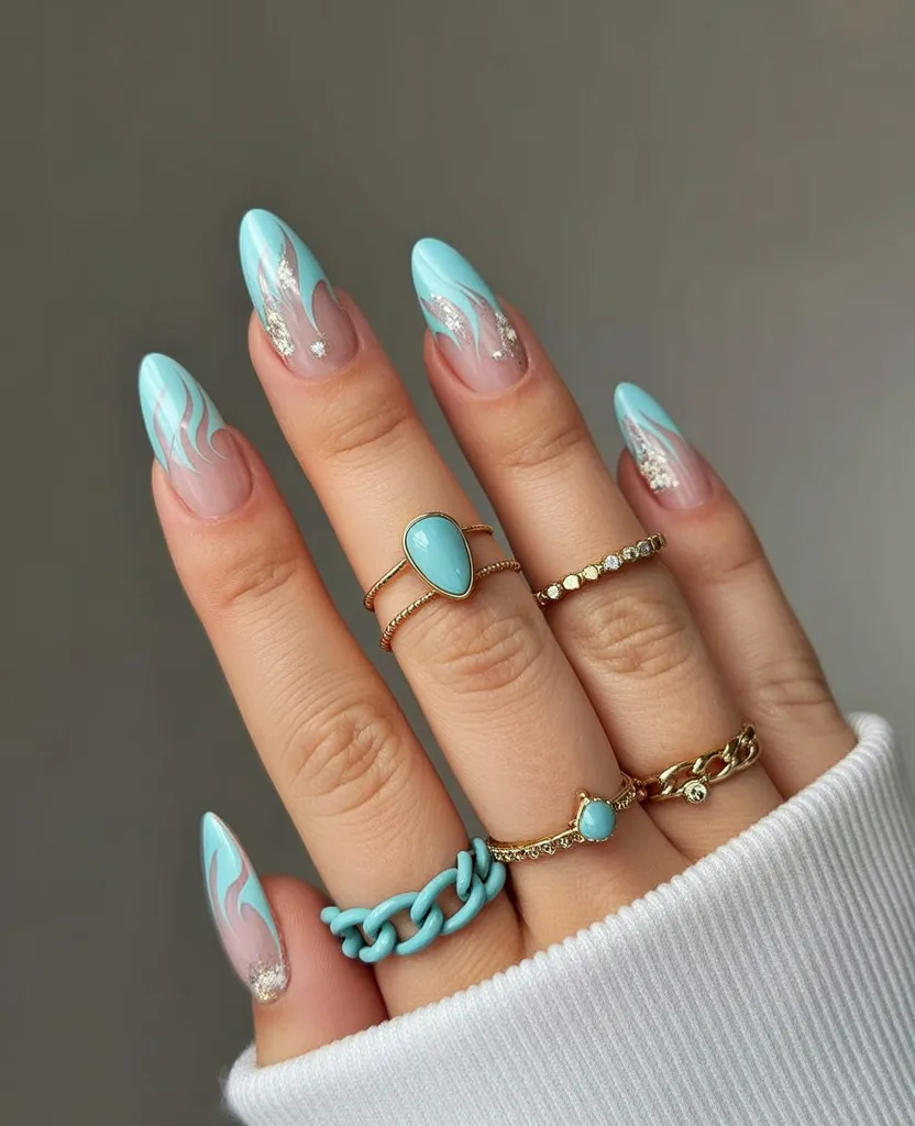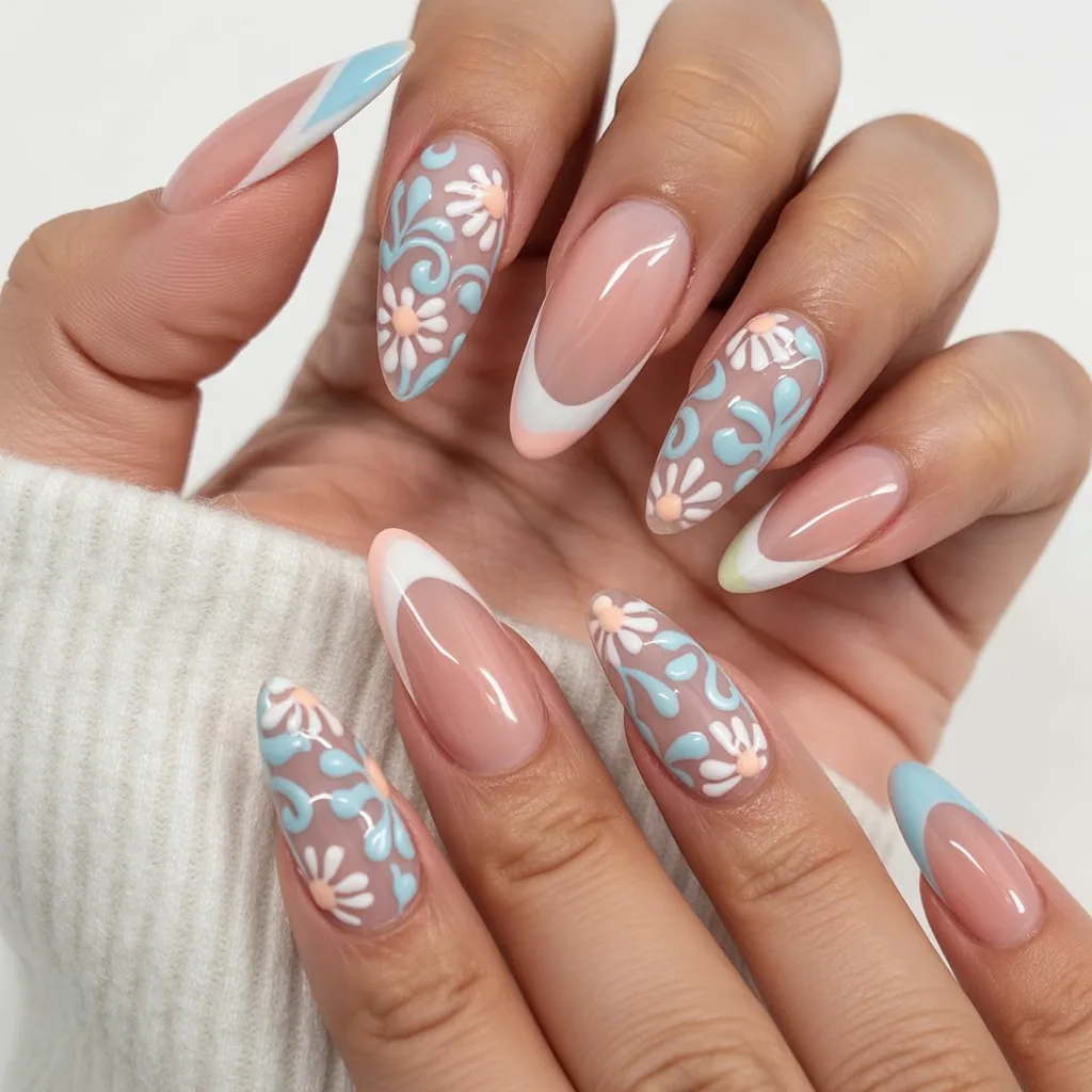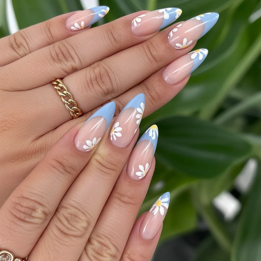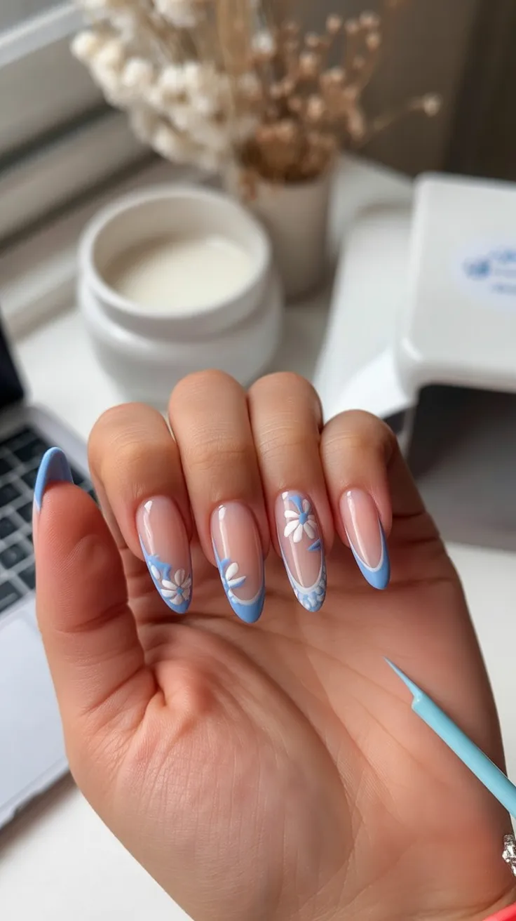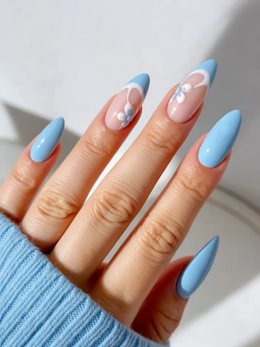 13. Sky Blue Almond Nails with Soft Floral Accents