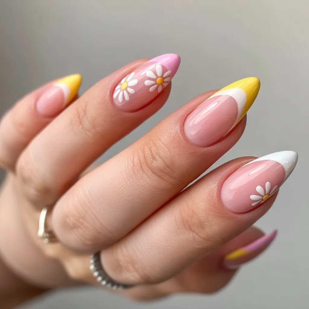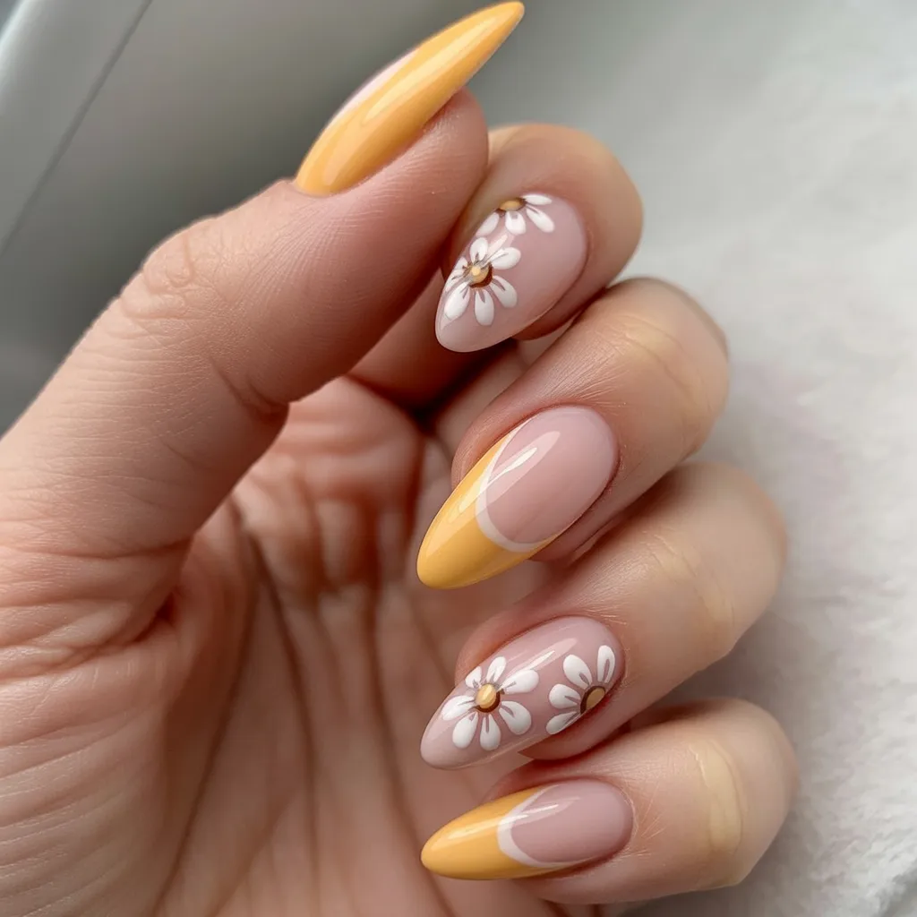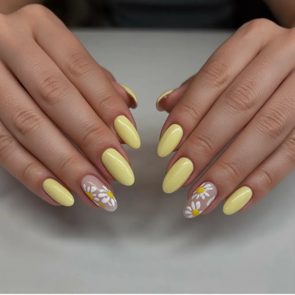 This look radiates warmth and optimism. The soft yellow tips feel sunny and bright, while the daisy Flowers bring a sweet, nostalgic touch that never feels childish. It’s the kind of manicure that makes you smile when you catch it in the light.