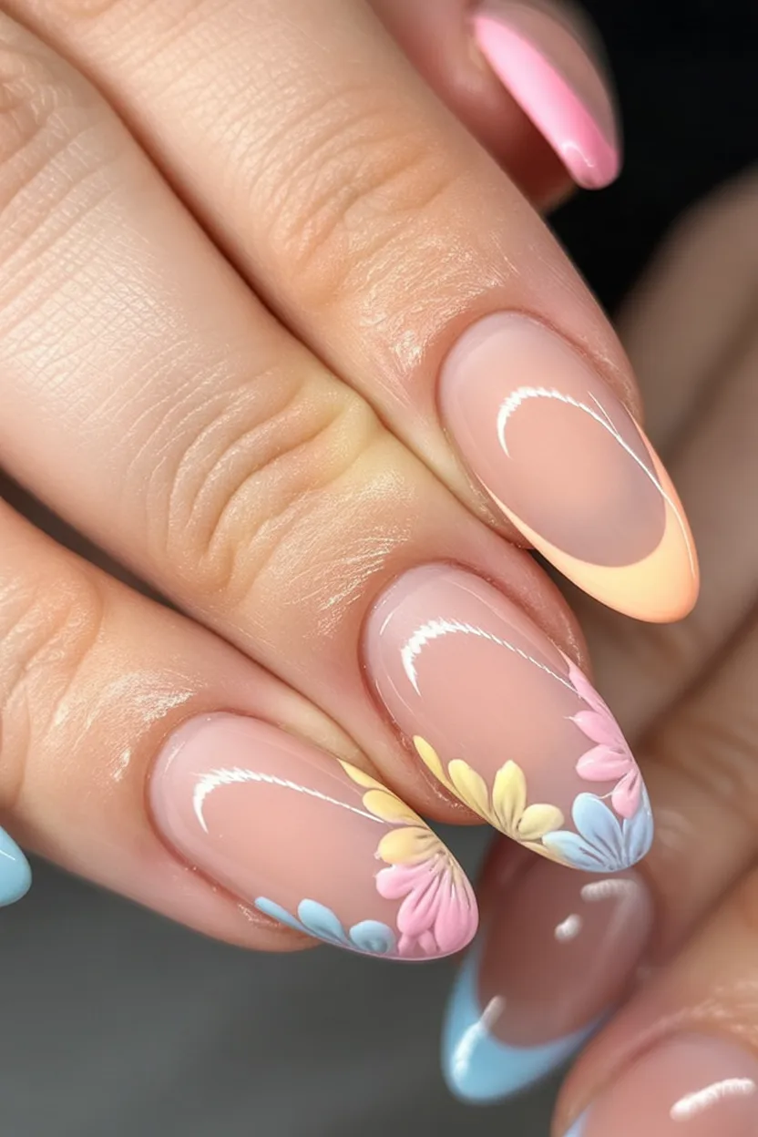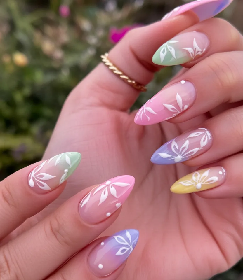 These nails feel joyful in the most effortless way. Soft pastel shades blend across each nail, creating a gentle rainbow effect that feels dreamy rather than bold. The delicate white floral design ties everything together, giving the look a romantic, almost whimsical energy.
