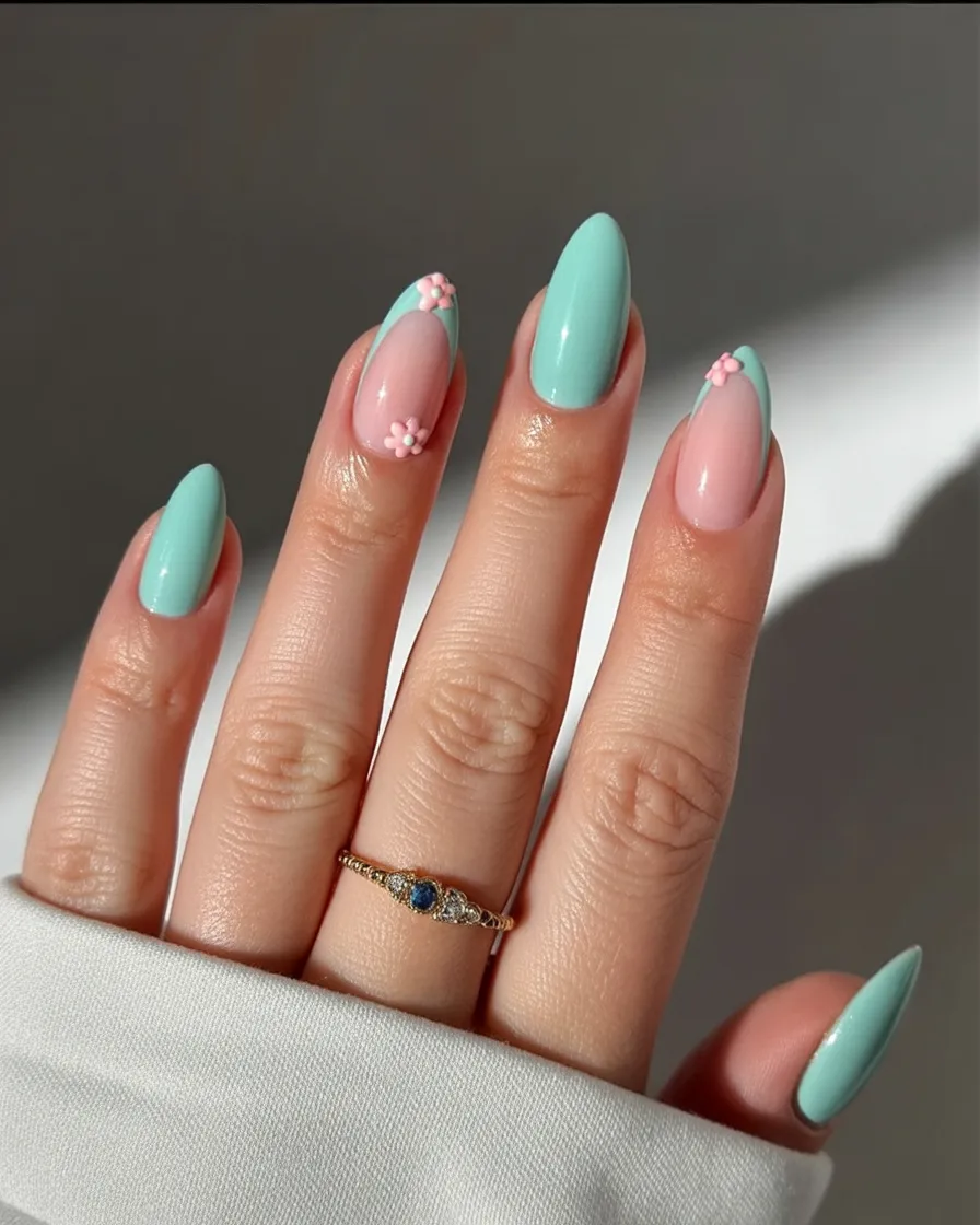 This manicure has a calm, modern feel that instantly relaxes the eye. The mint green shade looks crisp and clean, and the tiny flower accents add just enough softness to keep it from feeling too minimal. It’s fresh, airy, and very now—perfect for easing into brighter spring Colors.