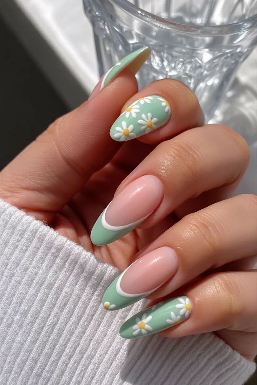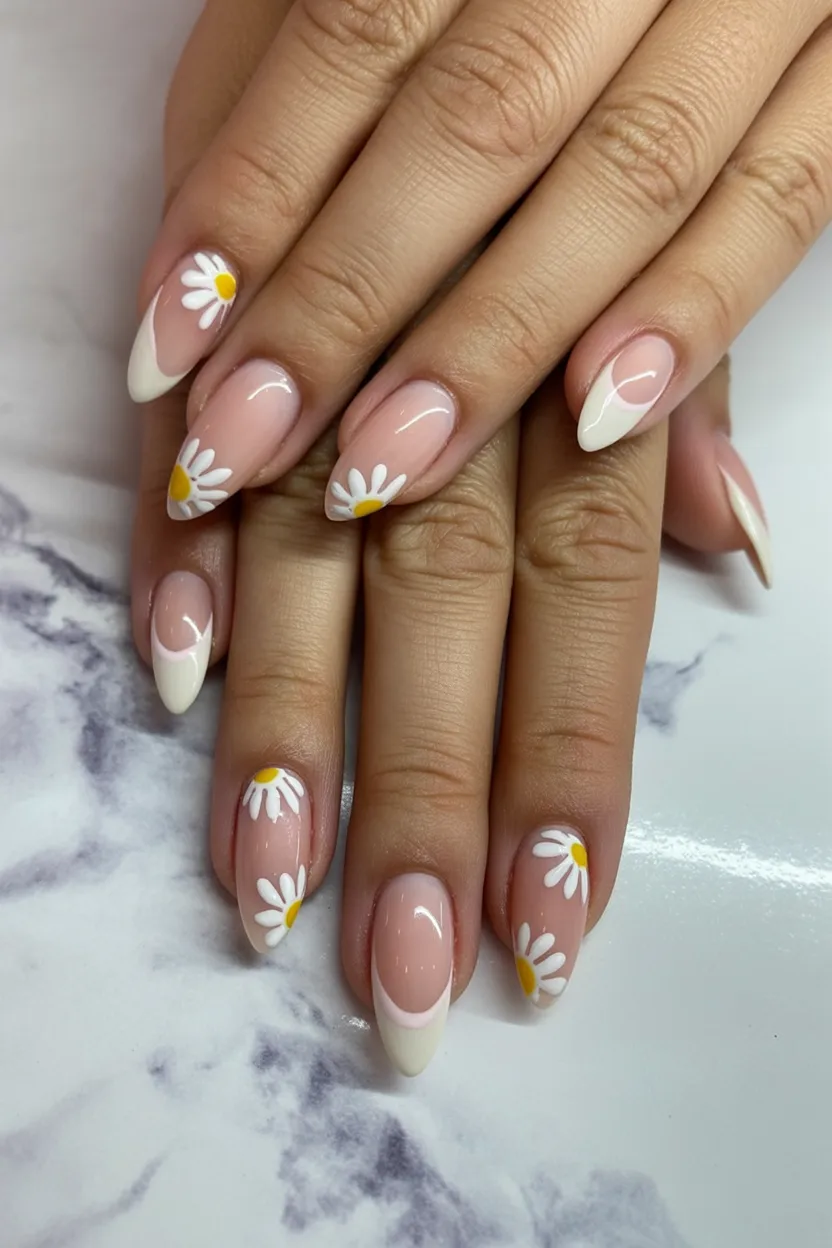 \u200b\u200b\u200b\u200b\u200b\u200b 16\u2022 Creamy French Almond Nails with Daisy Tips