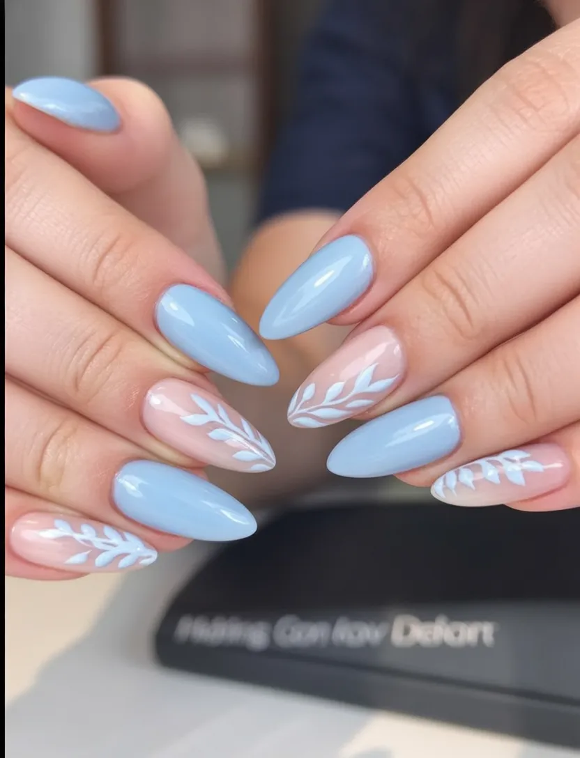 This manicure feels calm, clean, and quietly confident. The soft blue shade has that fresh-air quality, like a clear spring morning, while the subtle floral details add a gentle feminine touch. It’s polished without feeling stiff, modern without losing warmth—exactly the kind of look that makes your hands feel instantly put together.