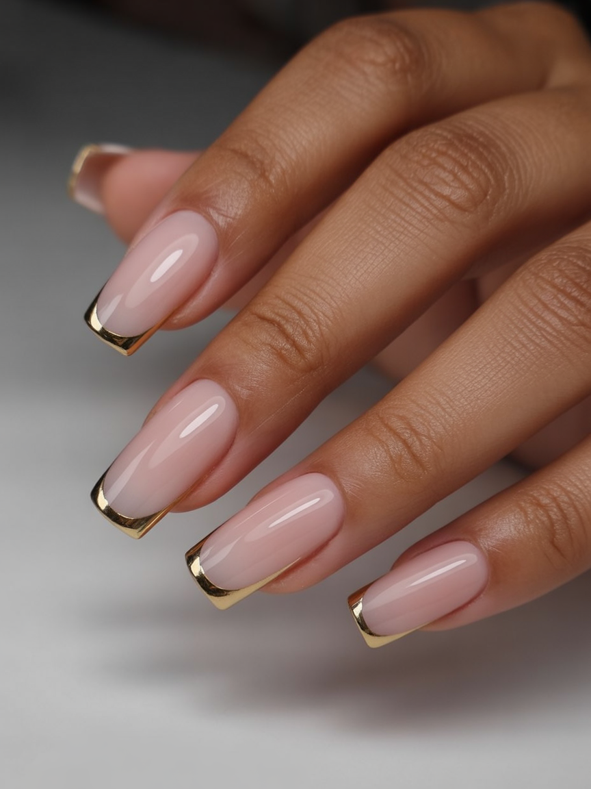 Sharp and delicate in this incredible twist on a nude mani. It has a slick high-gloss shine and is finished with extra-flat gold metallic ends which looks and feels like a dip of your fingertips into some liquid gold. It is upscale but not in your face in fact it is quite hard not to gaze.