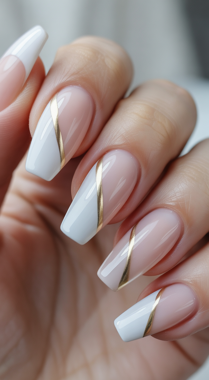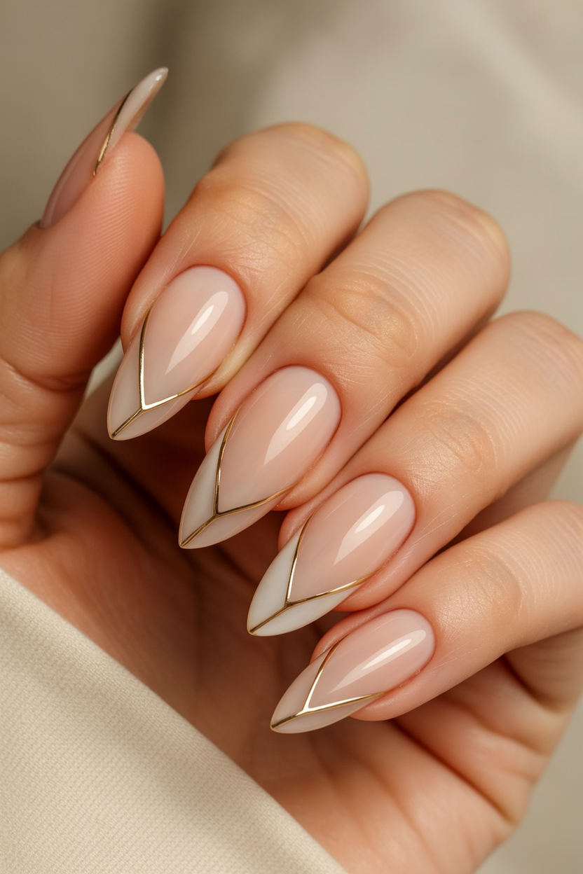 Sleek, tidy, and uber-chic, this French manicure with its V-shape feels like a power tool in manicure form. The clean chevron pattern drawn in gold radiates some structural vibe and the beige backdrop makes it look more stylish and elegant.