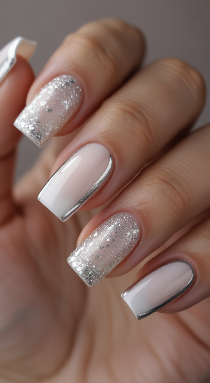 A striking play of shine and chrome, this manicure must belong to the woman who wants her nails to glistening like the fresh snows in the full moon. The combination of silver glitter and a shine metallic outlines makes it look modernistic and festive.