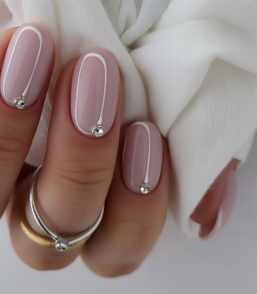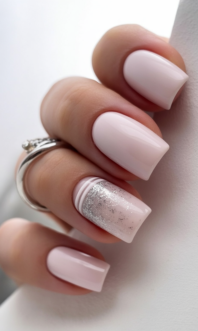 This design gives classic pink nails a playful twist. Most fingers are smooth in a soft blush, but one nail takes centre-stage with silver glisten and clean white lines. It is the ideal mix of sugar and spice–a little sweet, a little sharp.
