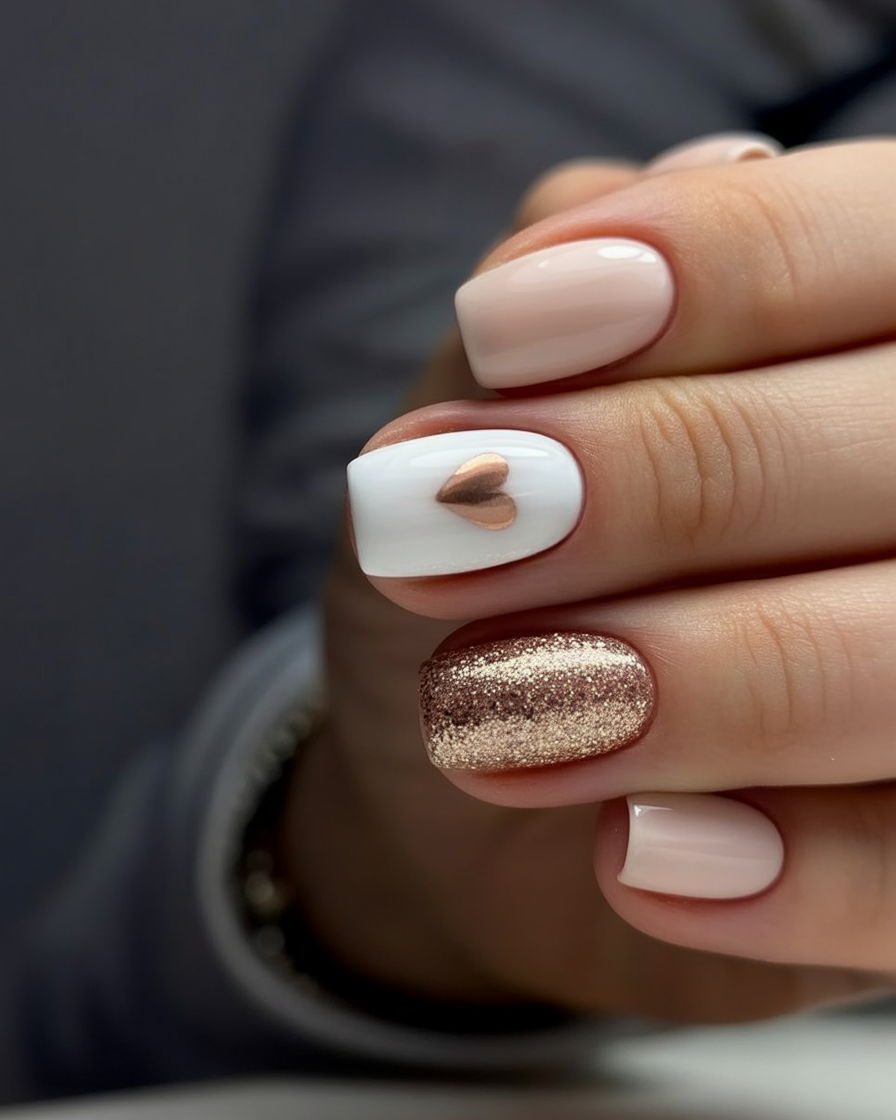 There’s something effortlessly romantic about this delicate combination of pale blush, glossy white, and that subtle, rose gold heart. It is a little delicate but still has a certain playfulness- like a sophisticated look that you might put on to celebrate a surprise date night or Sunday brunch with your best friend. The ring finger is set with an appropriate amount of glitz, reflecting light just enough to do the trick, but not too much as to be in-your-face.