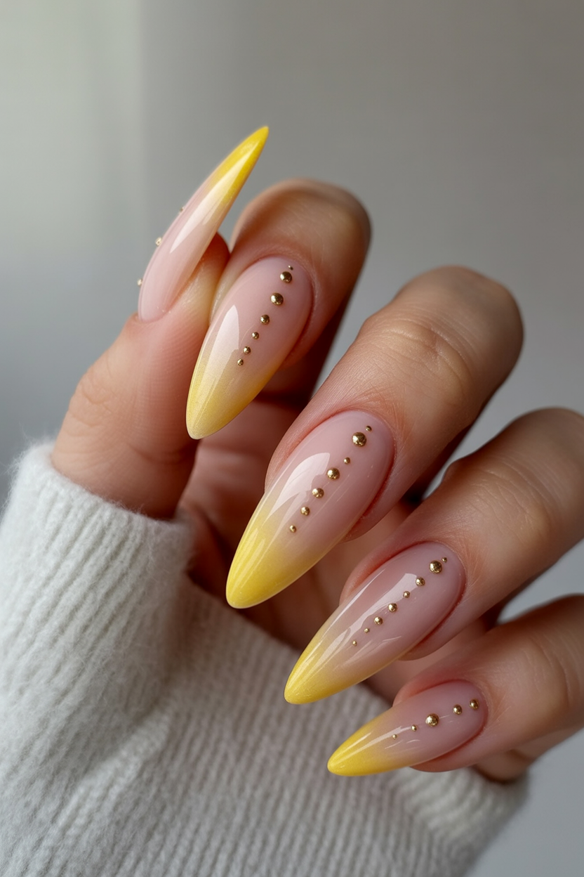 Just as the first sunrays that slip inside your house via your window during a sunny morning, this golden yellow ombr color nail design is glowing, airy, and slightly chic. A creamy-beige base with sunny-yellow tips are styled with tiny gold studs that almost seem like jewelry to the fingertips.