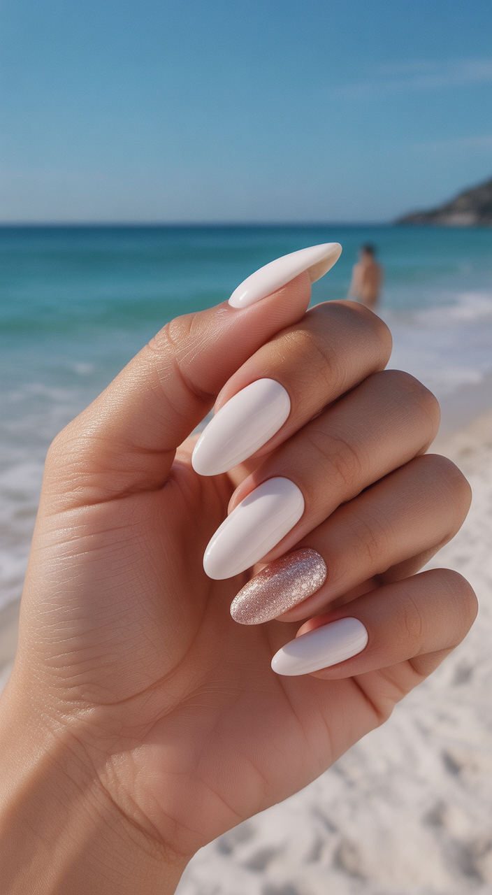 This manicure practically smells like sunscreen and salty waves. The delicately creamy base is fresh and light, and an accent nail with subtle rose-gold glitter gives a luxury touch to the sunshine. It’s relaxed, flirty, and effortlessly pretty.