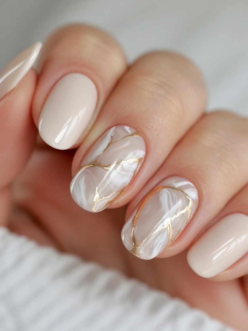Reminding of swirling cream in coffee, or quartz veins in rock, the marbled nail art is gracefully elegant. The exquisite gold veining combined with the different shapes of the nails makes each of them look a work of art- earthy and elegant, modern and timeless.