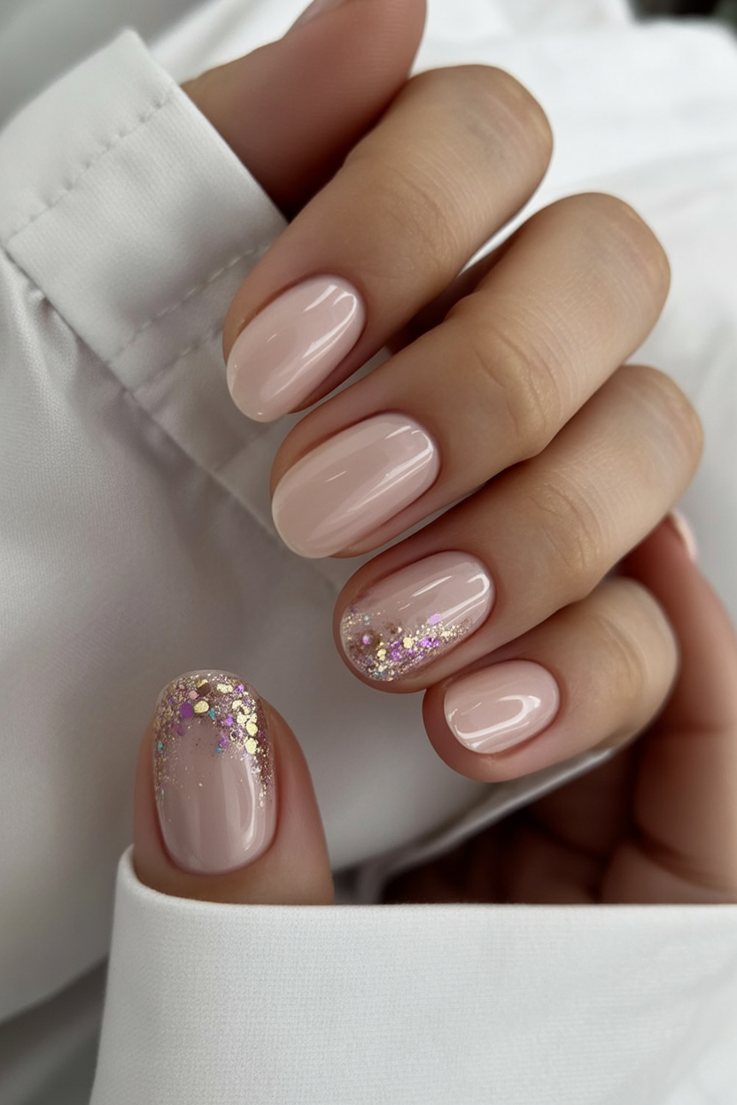 This is a mini-party on your nails: subtle, but fun-filled. The smooth nude foundation balances a clean canvas for shimmering particles of pink, gold, and lavender to play on the thumb and ring finger. It is sweet, youthful, a bit celebrating your soft side.