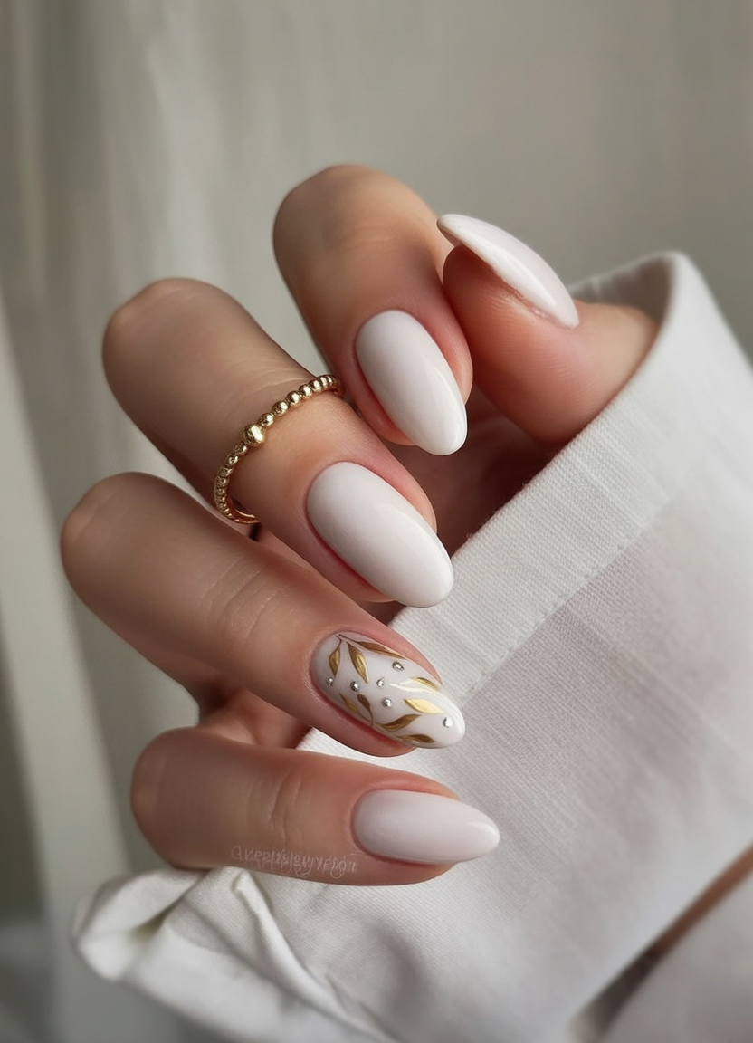 Subtle elegance never goes unnoticed. The classic styled and clean almond shape with milky white color has a nature-inspired idiosyncrasy in the ring finger a pliable golden leaf and pearl dot decoration that is subtle and, at the same time, feminine.