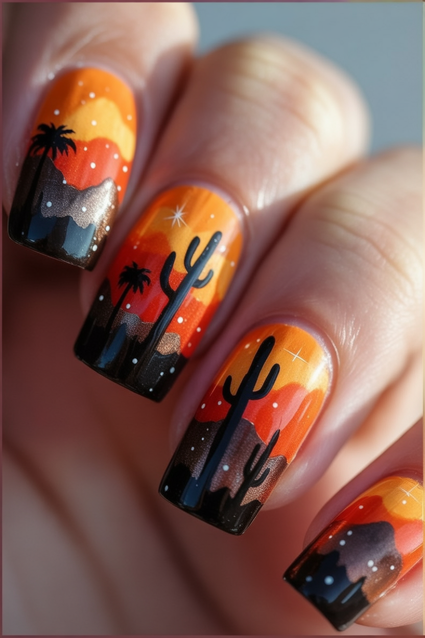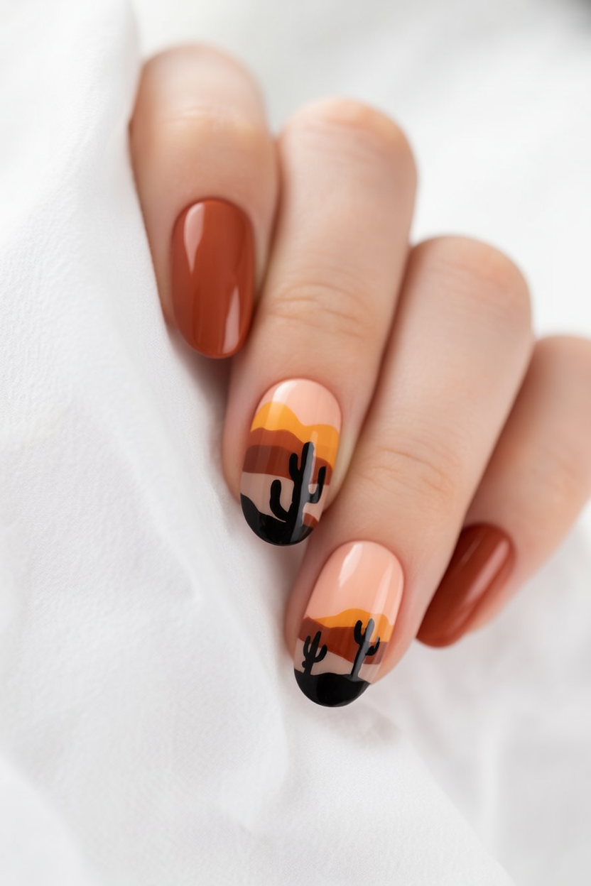 These nails are the feeling of a hot desert wind in a manicure. The light of the peach base combined with the sweeping amber colors gives it a golden-hour dimension and the hand painted cacti shapes give that quintessential western feeling. It is not loud but it is bold and it is just perfect fall. You can almost hear the tumbleweed rolling by.