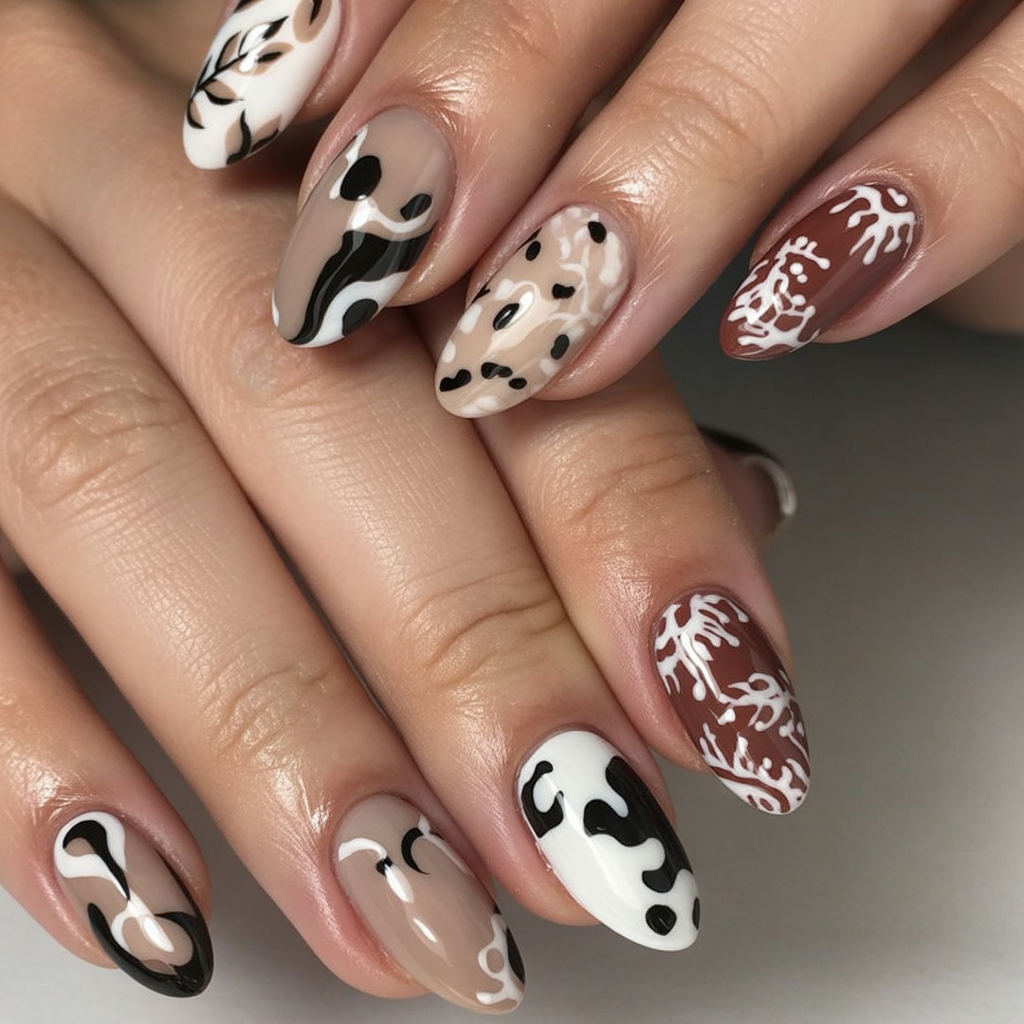 This crazy combination of western art is like an elegant scrapbook of fall all the cow print (on the earth), one could find squiggles and smooth florals combined together in one classy set. It’s eclectic, artsy, and full of personality. Every nail has a little story to itself but somehow it manages to fit.