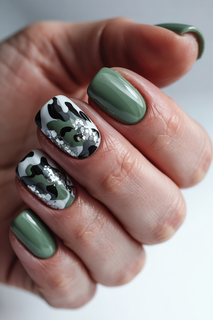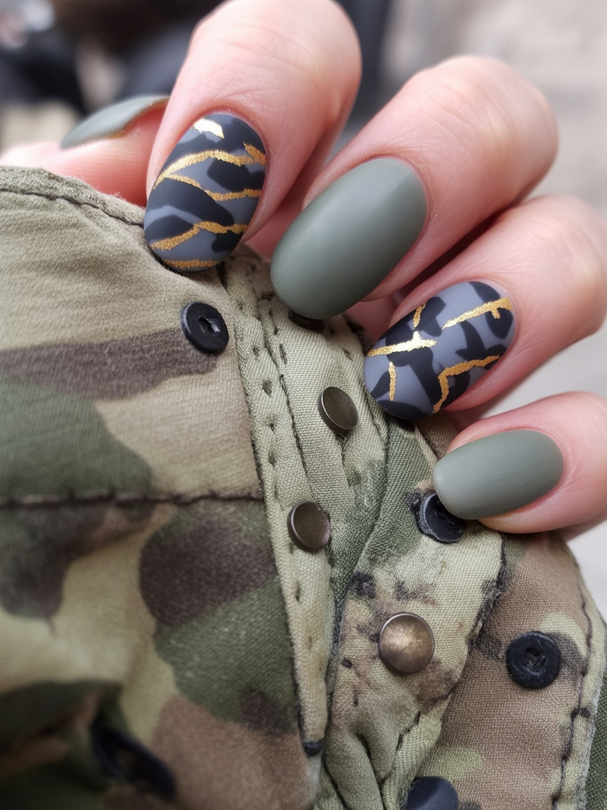 Edgy yet earthy, these olive and charcoal camo-inspired nails bring a tough western feel with a glam twist — just look at those golden streaks! It’s like fall foliage meets military chic, and the matte finish pulls it all together perfectly.