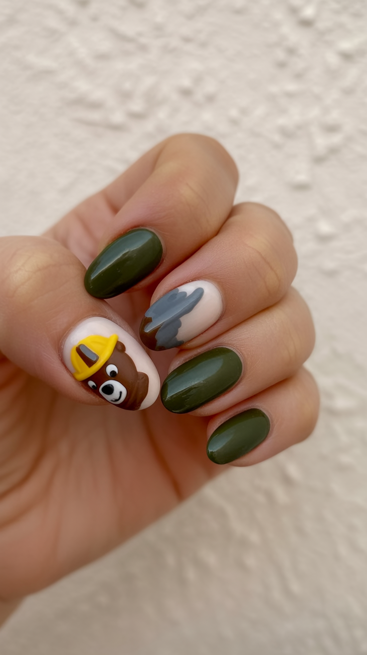 How adorable is this little nod to Smokey Bear? The polish is forest green, with hand painted trees, and that darn cute cartoon ranger hat, this manicure is reminiscent of the camp fire. It tastes like cold leaves, resin and the mountains during my kidhood.