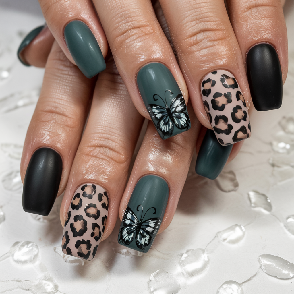 This collection seems like a strong, autumn wind, both untameable and sophisticated at the same time. The moody teal, sleek matte black, soft leopard print and delicate butterfly art form a strong, but rather earthy style. It is a stroll in something that is fresh and cool in the woods-style that floats in your fingertips.