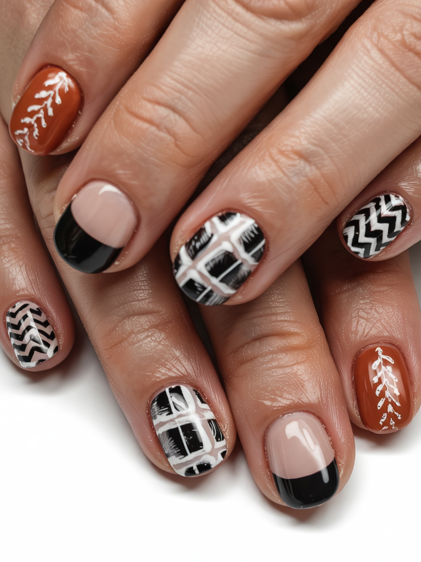 This look channels that cozy-western-fall energy with a twist. The tribal and the geometric patterns contrast with each other in white and black, whereas the warm terracotta color is used to infuse the grounding energy. They are sort of a signature weaved poncho on your nails, it is chic, daring and original.