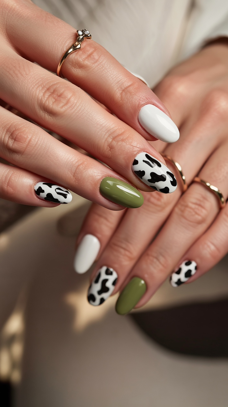It is nice to see this mix of creamy whites, deep olive and high contrast cow print. It has enough volume to make a statement, but it does not shout. The rounded almond form is softer, and it makes it easy to digest. The green provides a down-to-Earth look – similar to autumn on a farmhouse.