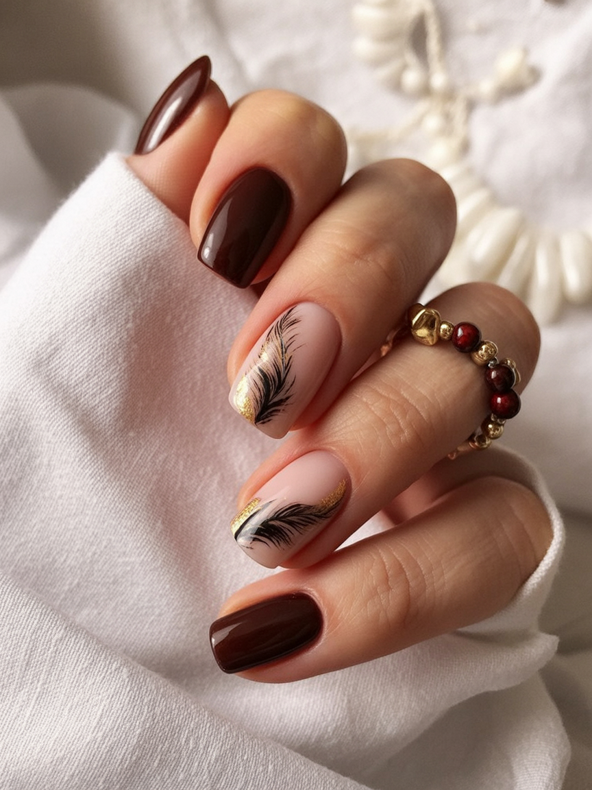 Light, gentle and slightly magical this hand drawn feather elegant warm cocoa nail set is like a cup of spiced cider. It’s romantic western meets soft glam, with an emphasis on quiet luxury.