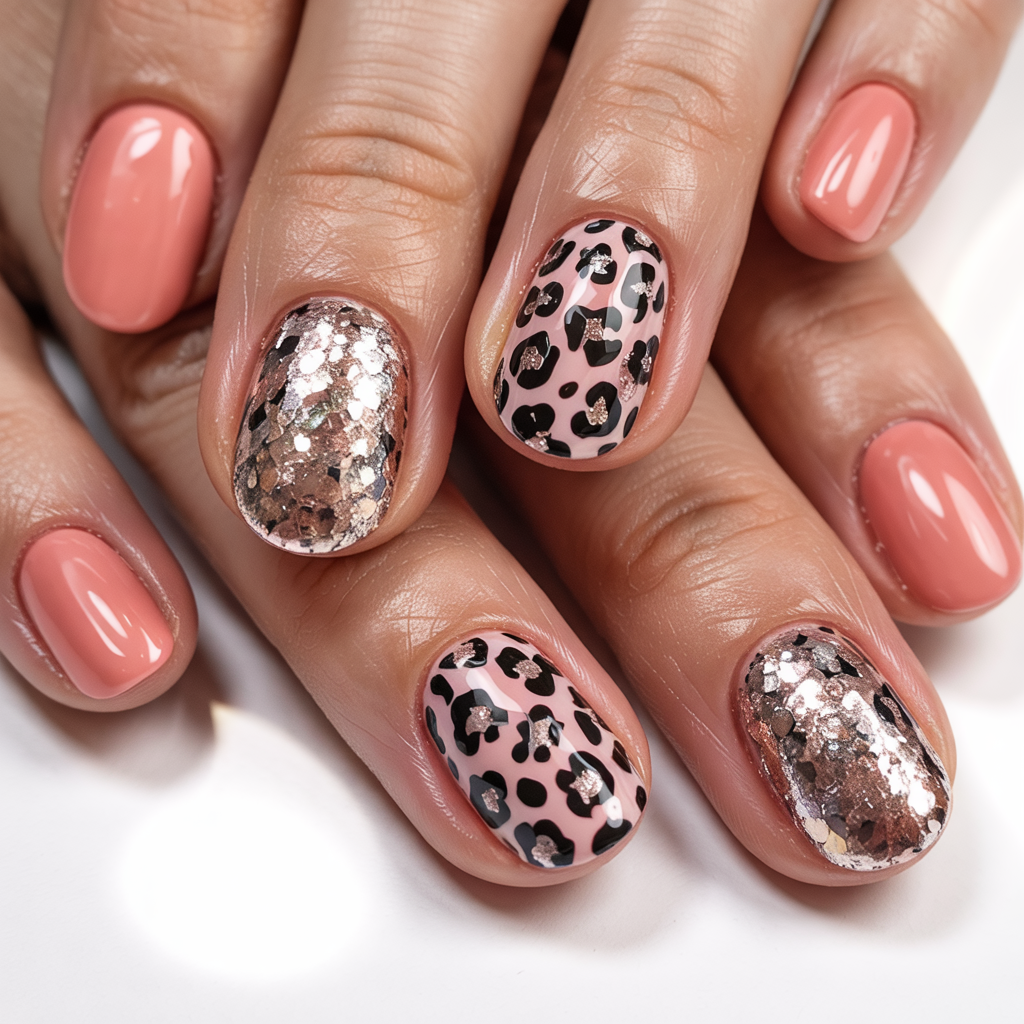 The design exudes pure joys to your fingertips like cowgirl boots with rhinestones glittering under the string lights. The pink, leopard print and thick rose gold glitter are peachy and so soft with a glam western feel that is just downright fun.