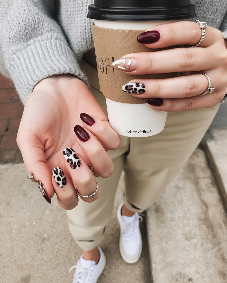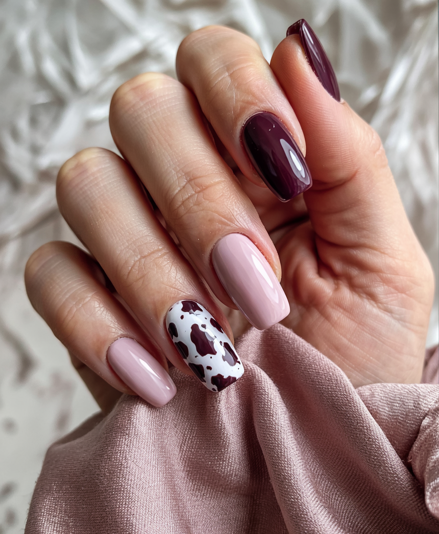 This line combines sweet and sassy with soft blush polish, bold burgundy and cow print highlights. It is this sort of nail art that is fall decent and romantic enough, but not too much sharp in order to leave a lasting impression.
